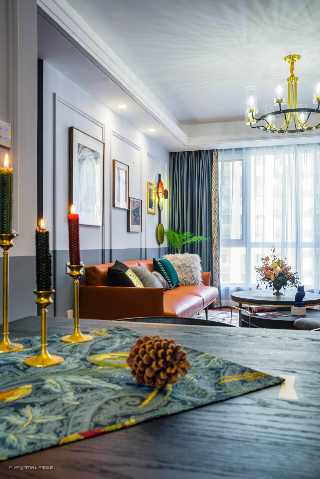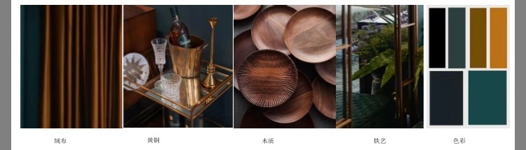 高低错落的装饰画与黄铜元素,与本案的复古风格相呼应,提升空间质感氛围。