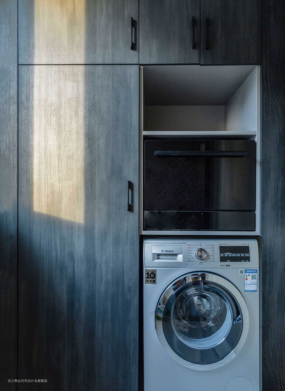 利用原本厨房下水的关系,将右侧的小阳台改造成洗碗机+洗衣机为一体的功能性储物间,提升空间利用率的同时也让生活更加便利。