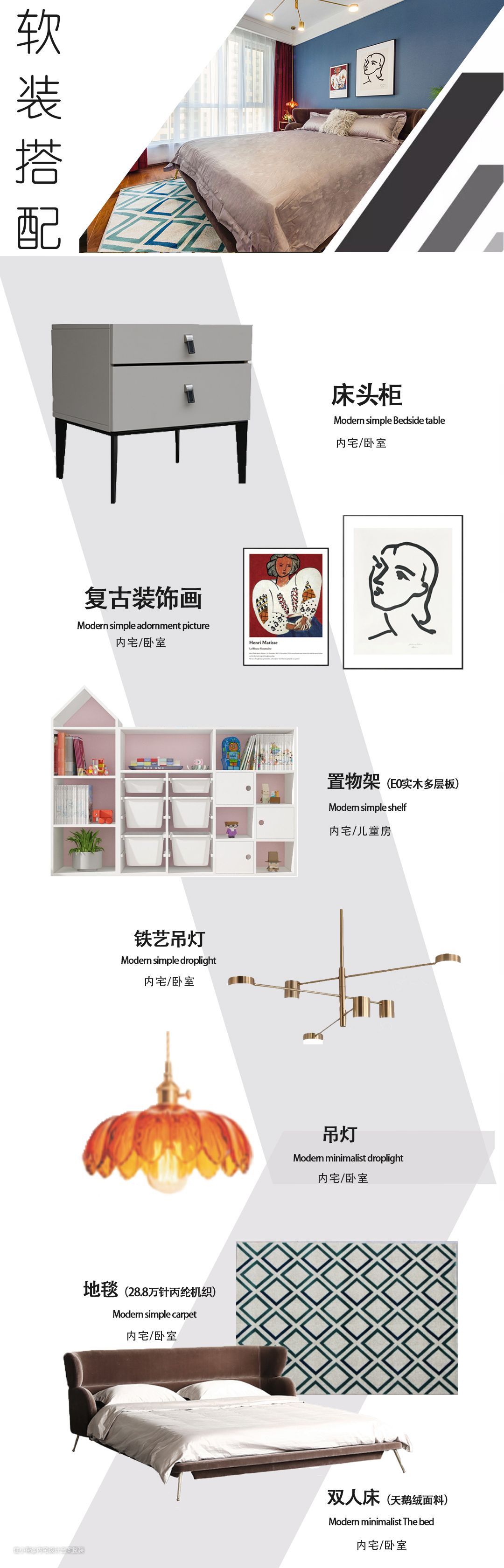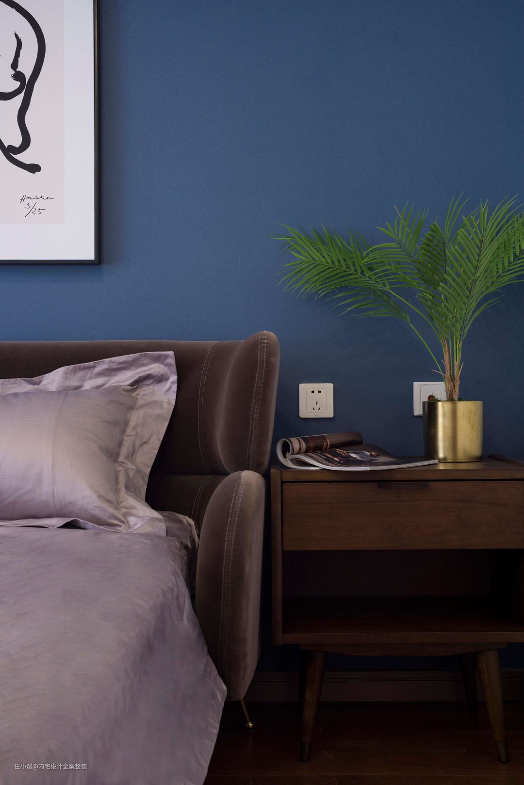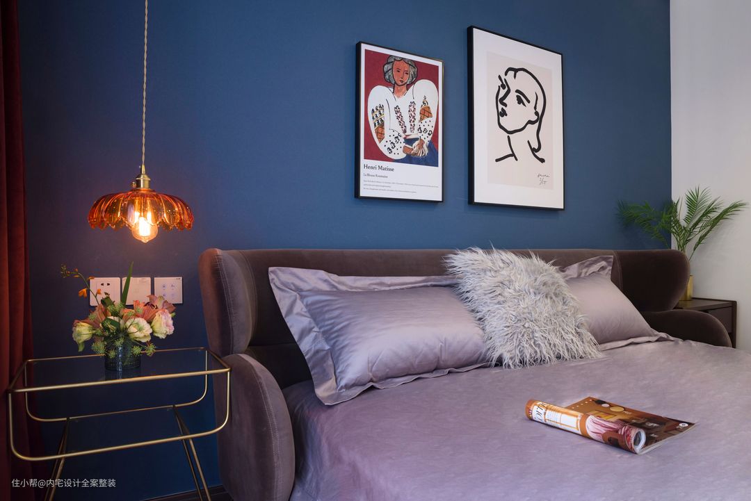 卧室以低饱度较低的蓝色+暗酒红进行色彩碰撞,再运用金属色点缀空间,营造出一种轻奢复古的质感氛围。