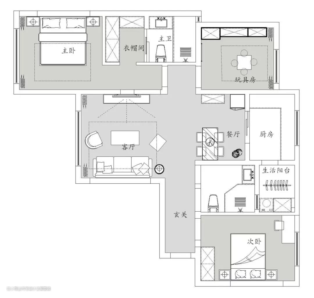 1.改善客厅格局,使得动线更加流畅,增加了备餐区域