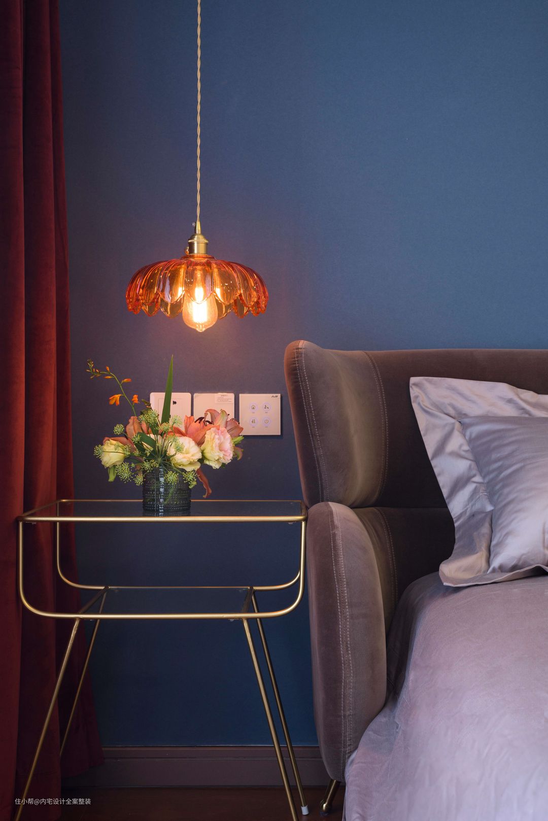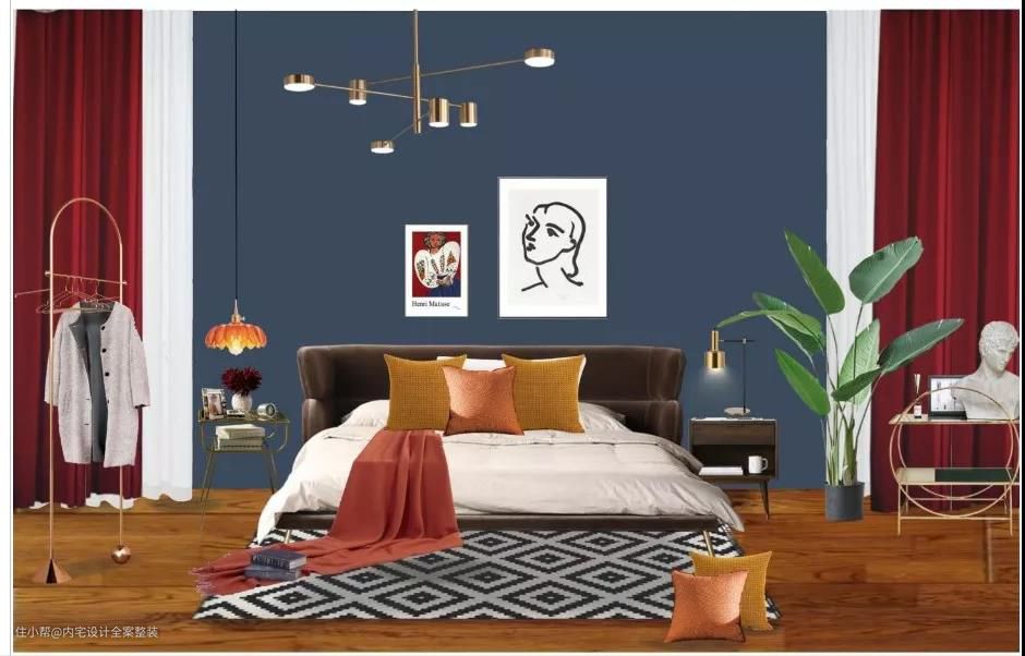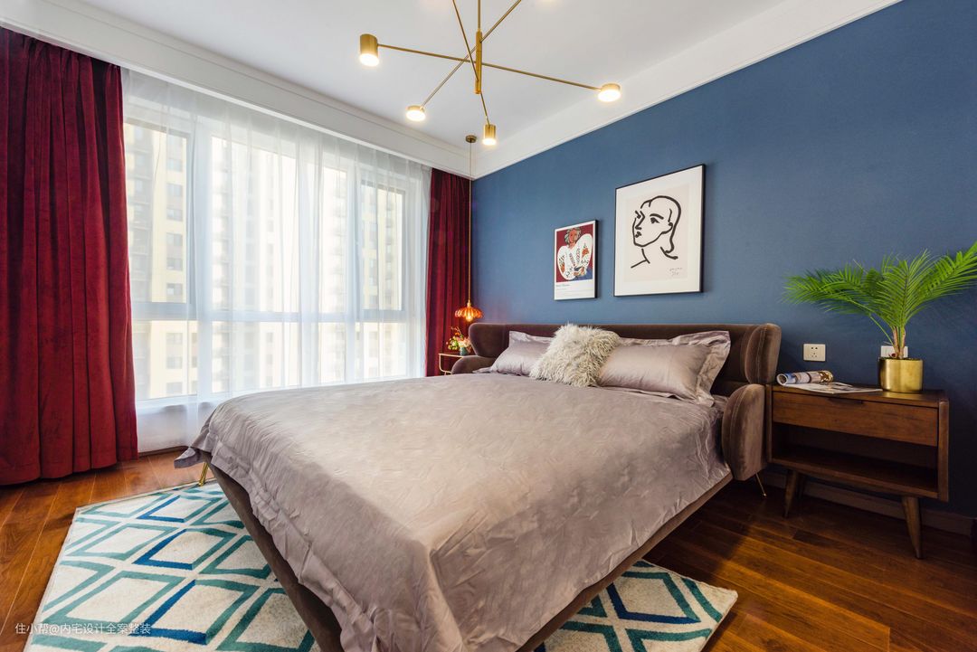 卧室以低饱度较低的蓝色+暗酒红进行色彩碰撞,再运用金属色点缀空间,营造出一种轻奢复古的质感氛围。