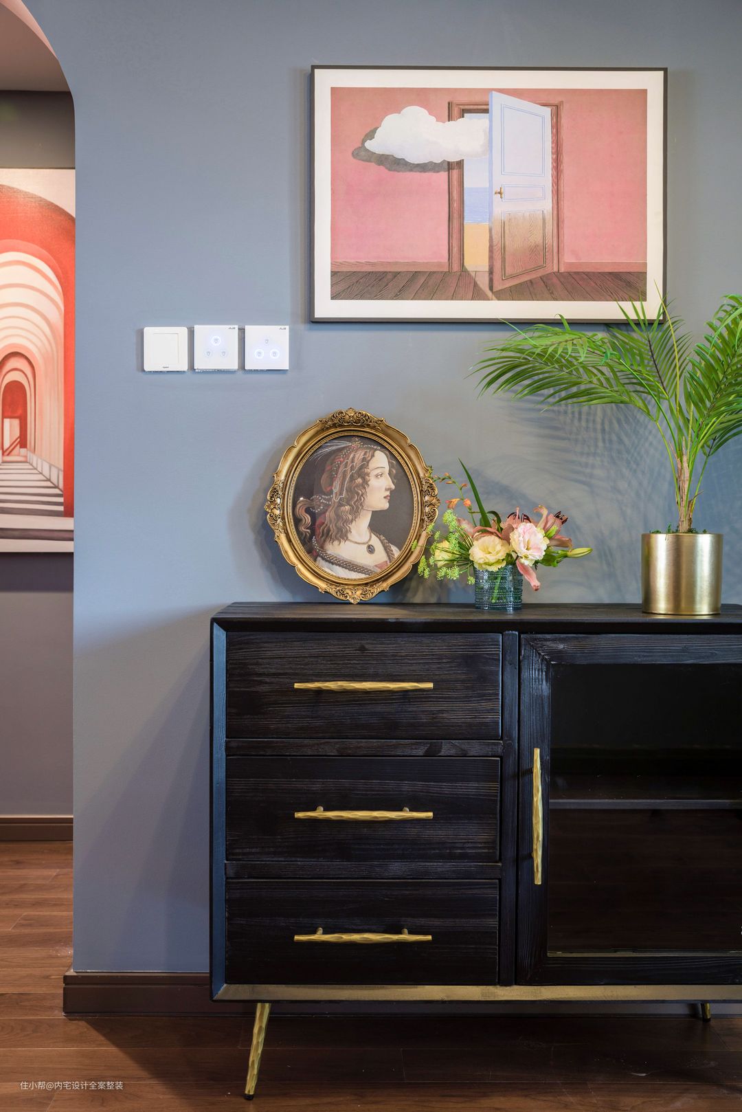 一副高饱和度的意境画作+几抹黄铜元素,再与精心配置的花艺点缀空间,让一切都恰到好处完美融入。