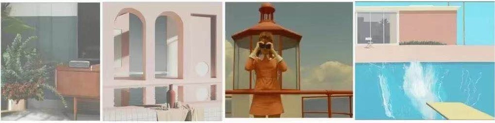 本案以低饱和度的色彩和平衡式构图,结合时尚前卫的建筑门廊以及趣味几何元素,营造中世纪的复古情调。