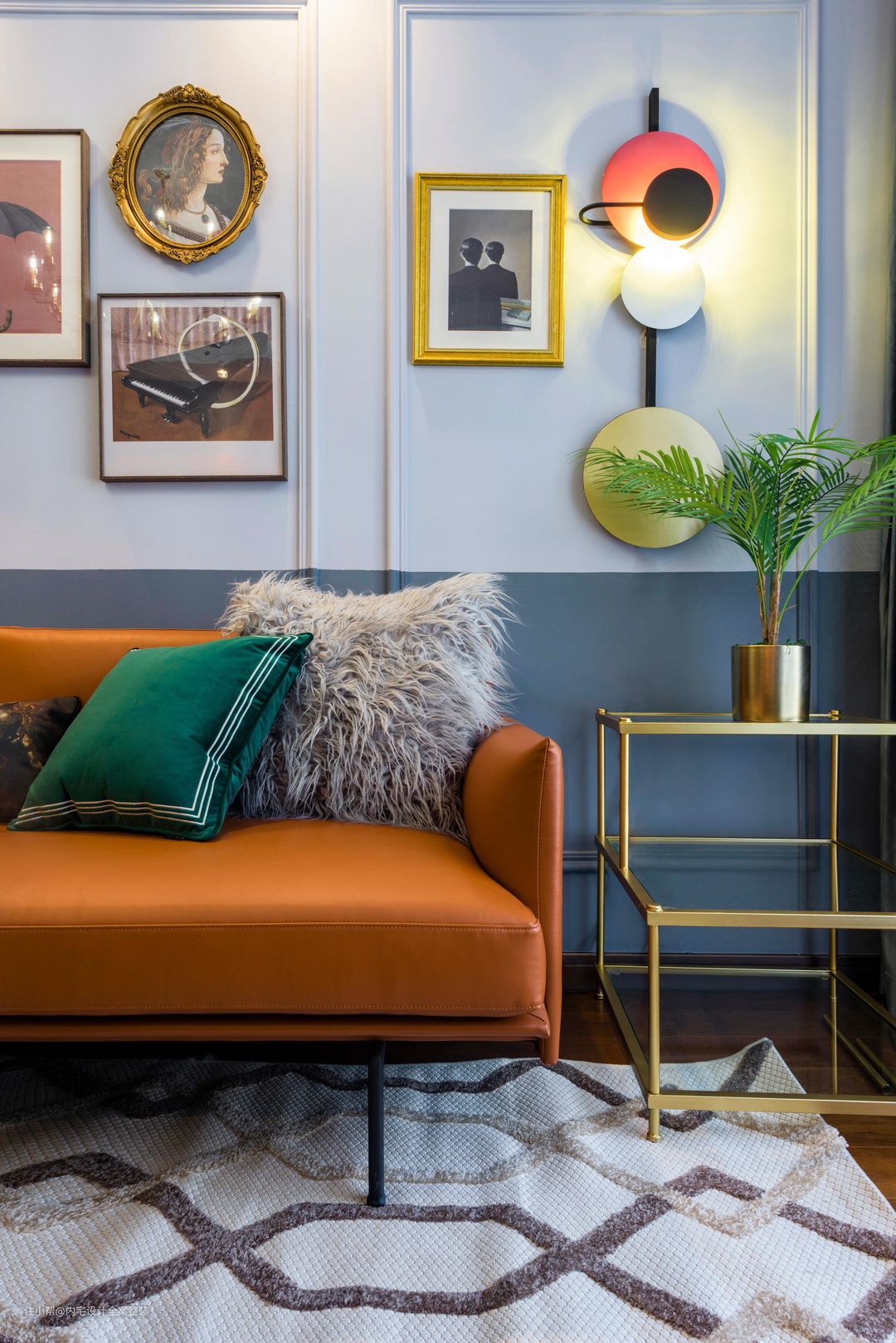 高低错落的装饰画与黄铜元素,与本案的复古风格相呼应,提升空间质感氛围。
