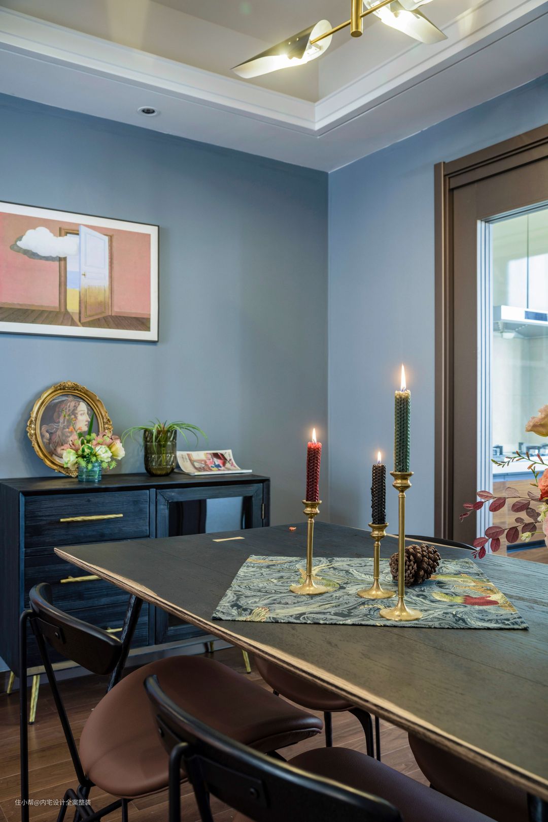 餐厅简化的墙面巧好避免了繁琐复杂带来的累赘感...黑色仿古餐边柜勾勒空间轮廓。