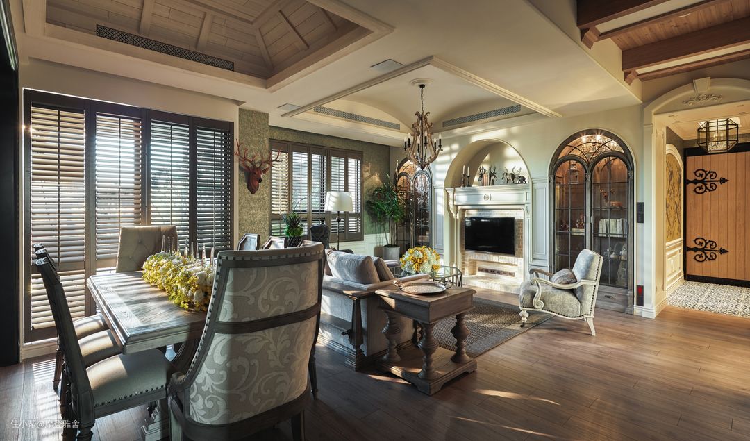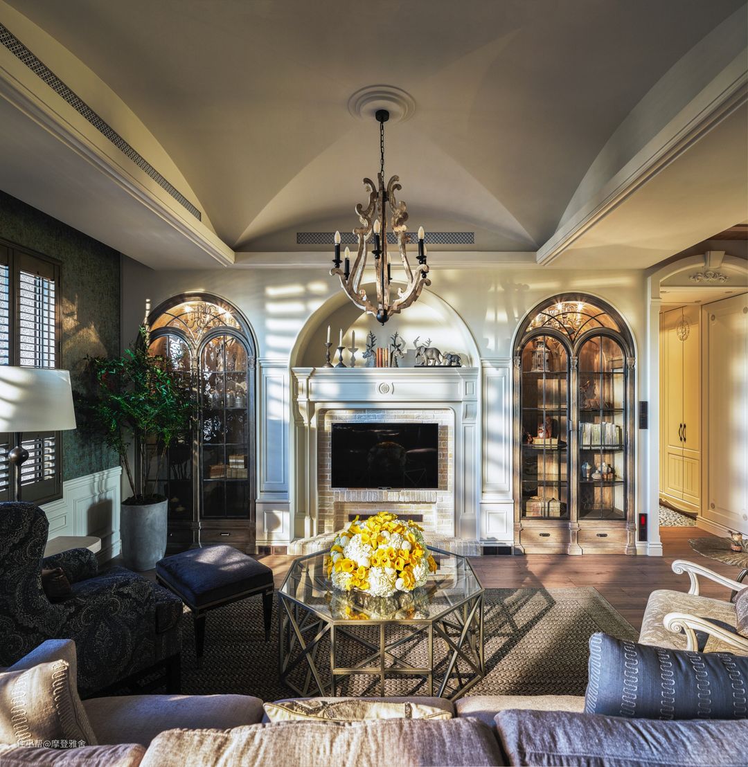 客厅的壁炉电视墙透过拱型玻璃造型,修饰对称式门片的展示柜,并以璀璨的仿古吊灯作为亮点,为家人的休闲区域带来宛如电影场景的经典气息。