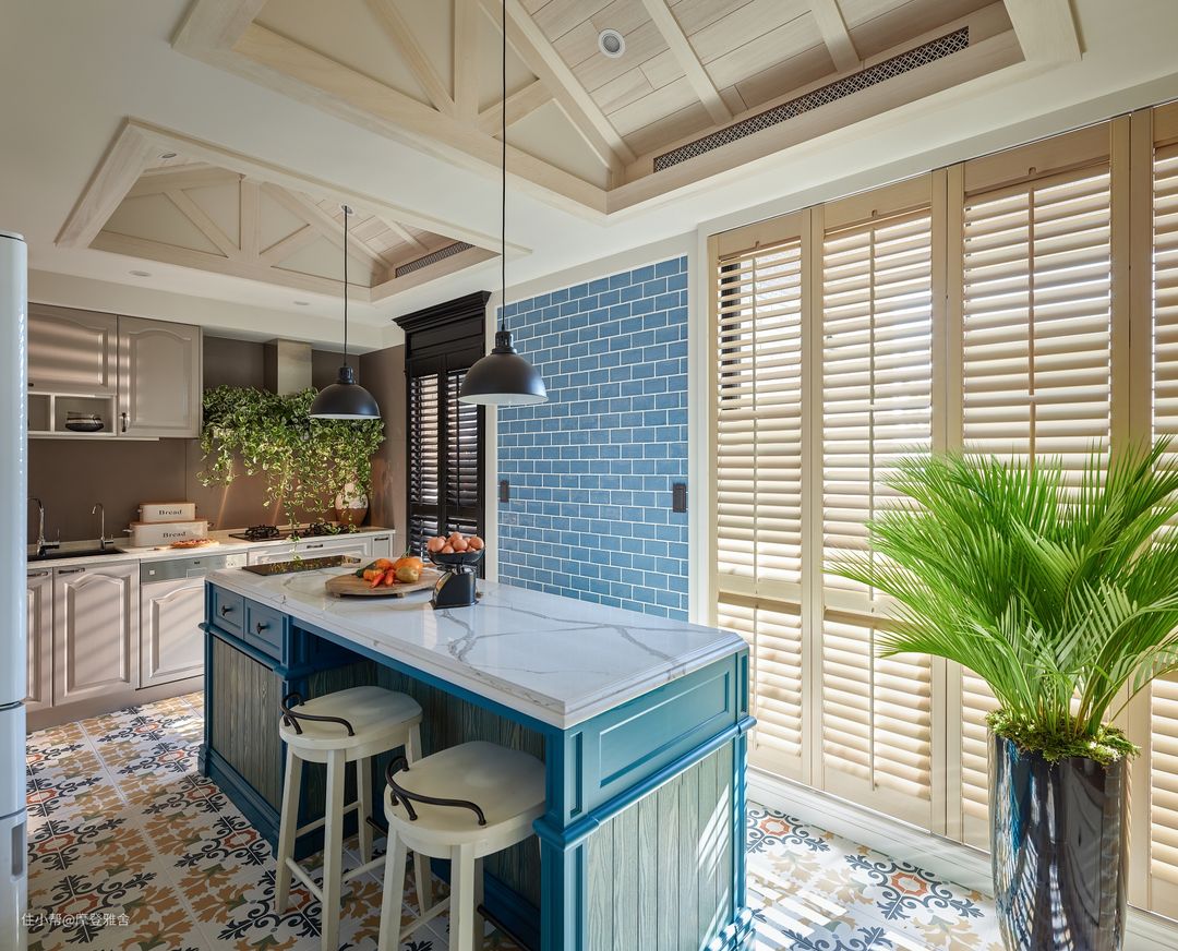 水蓝色中岛厨房一圆男主人的料理梦,天花板、门片的挑选都充满乡村风语汇,佐以花砖地坪的点缀,让一家人可以融洽地共享下午茶时光。