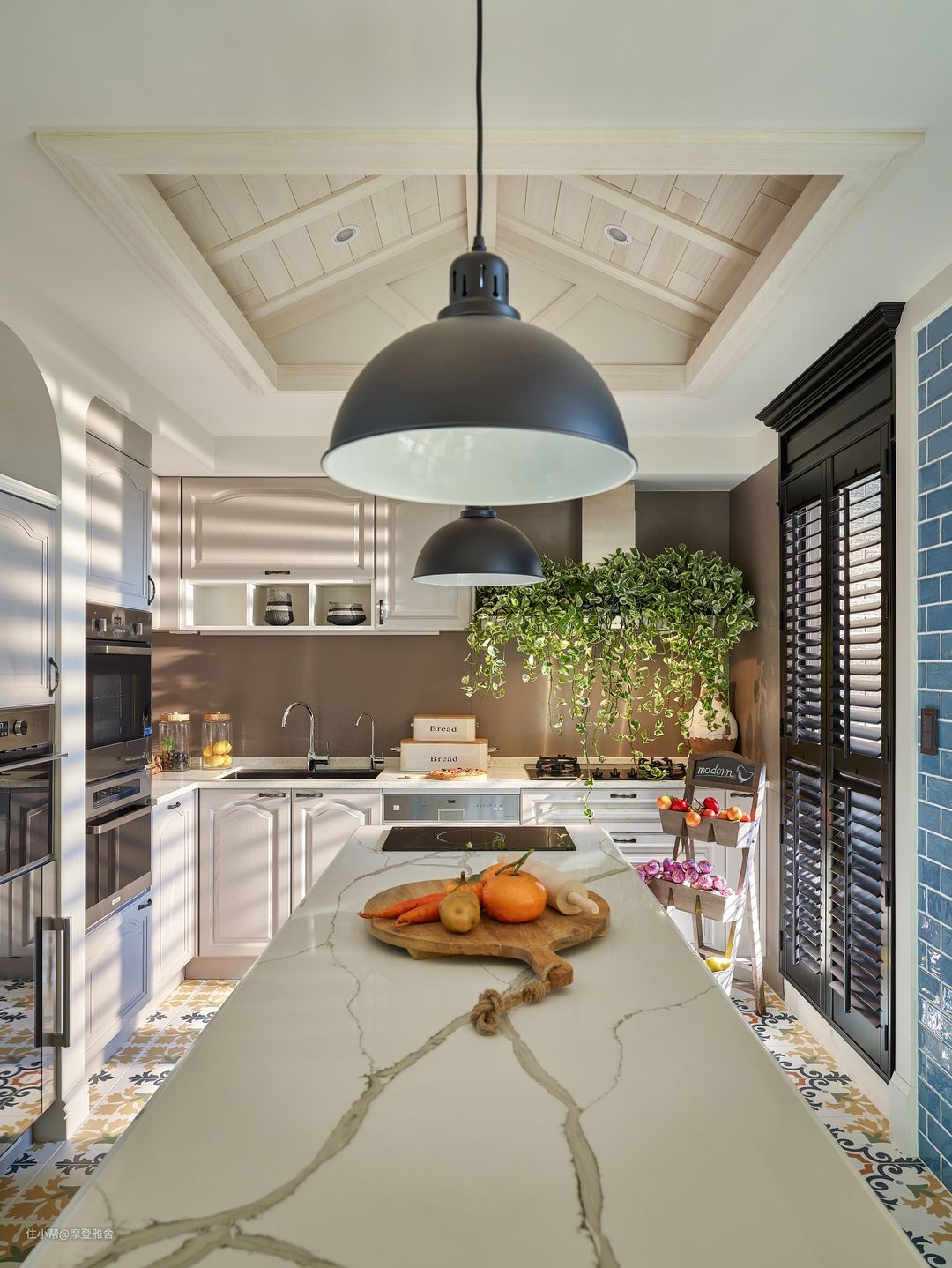 水蓝色中岛厨房一圆男主人的料理梦,天花板、门片的挑选都充满乡村风语汇,佐以花砖地坪的点缀,让一家人可以融洽地共享下午茶时光。