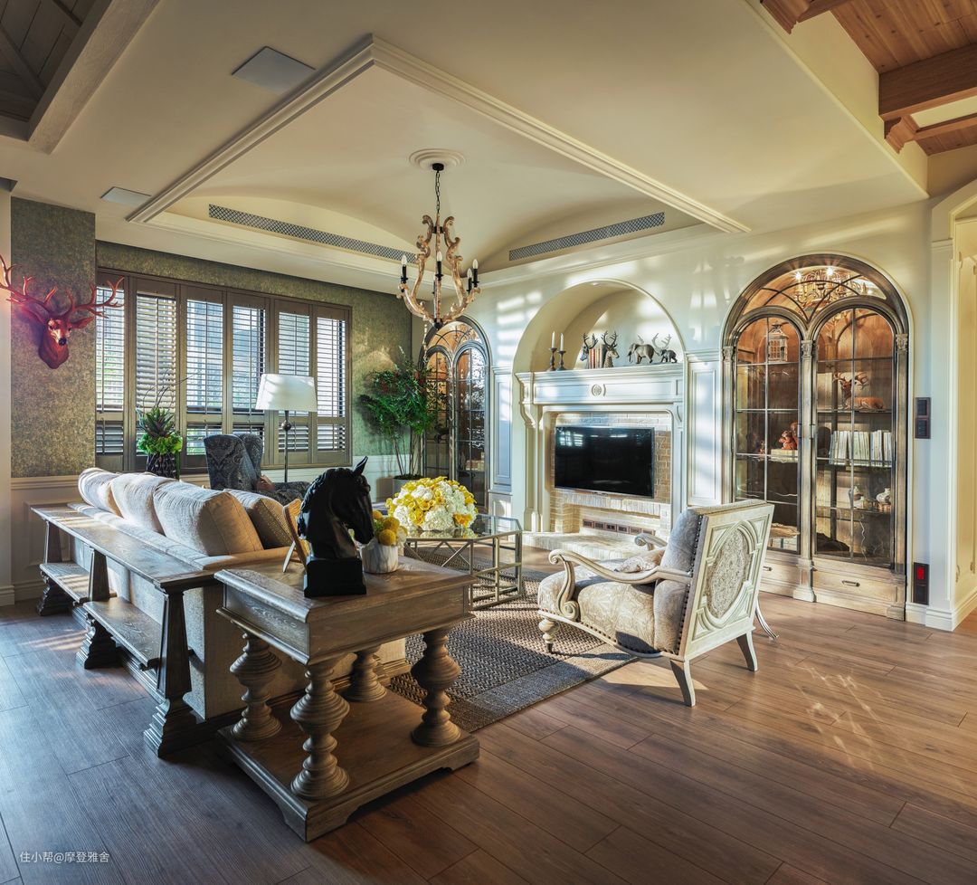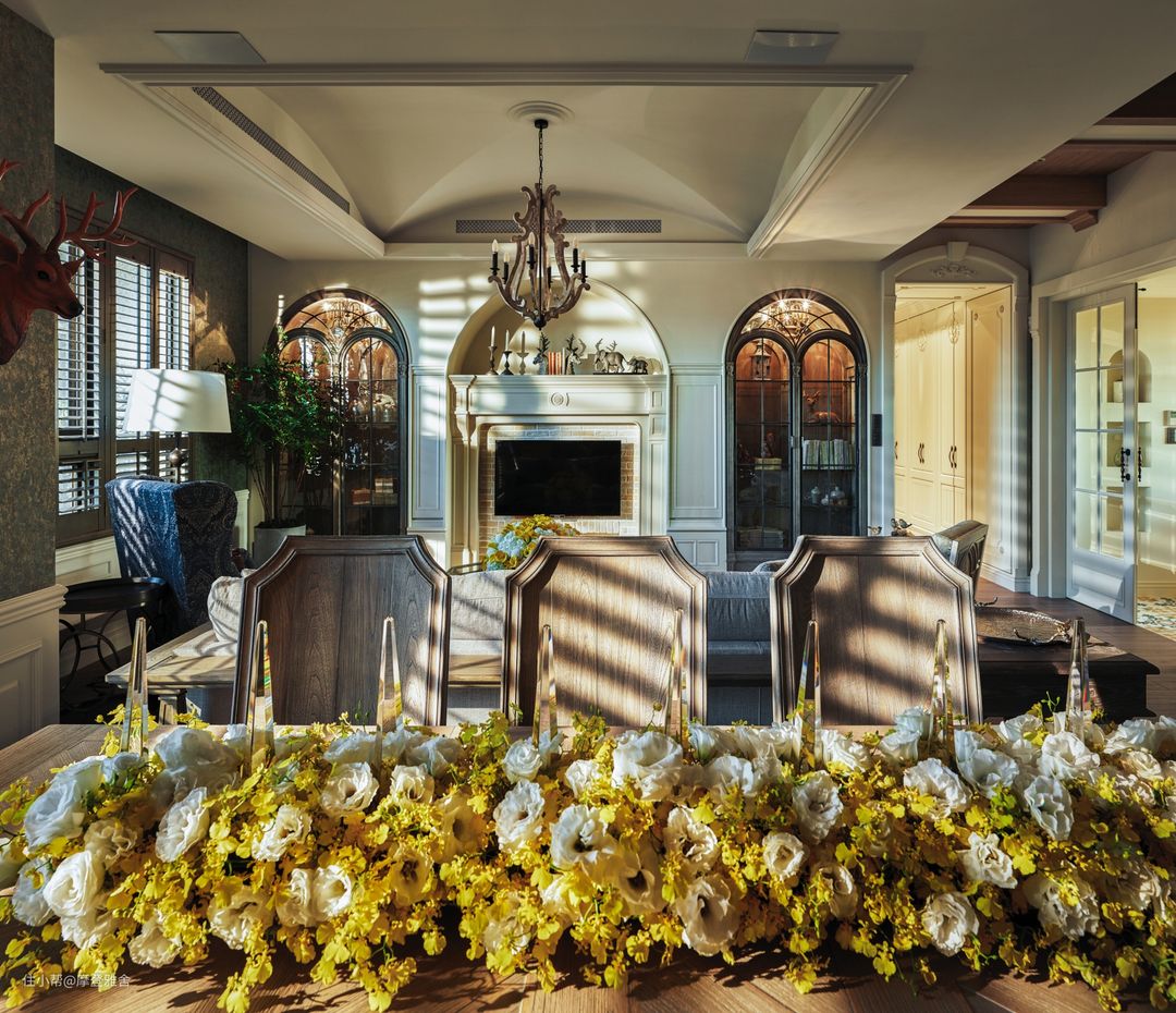 客厅的壁炉电视墙透过拱型玻璃造型,修饰对称式门片的展示柜,并以璀璨的仿古吊灯作为亮点,为家人的休闲区域带来宛如电影场景的经典气息。