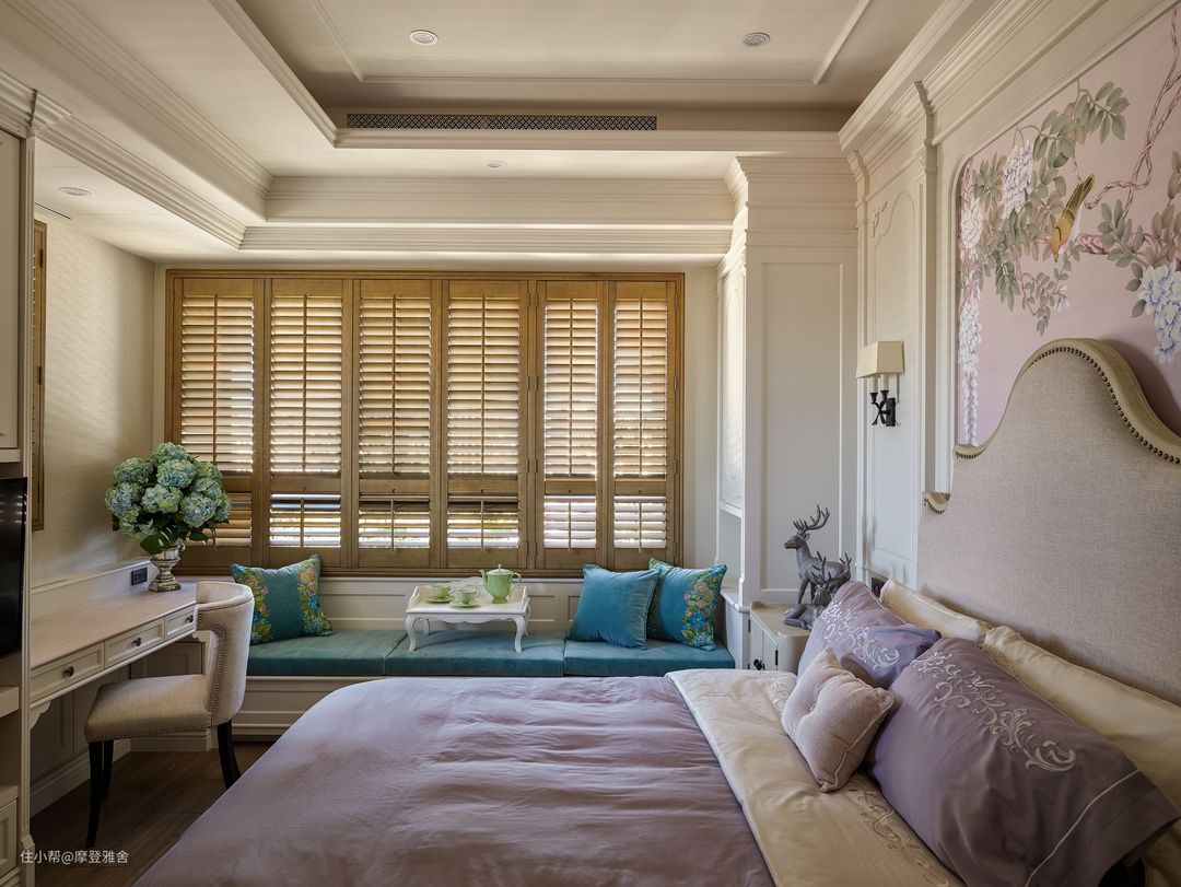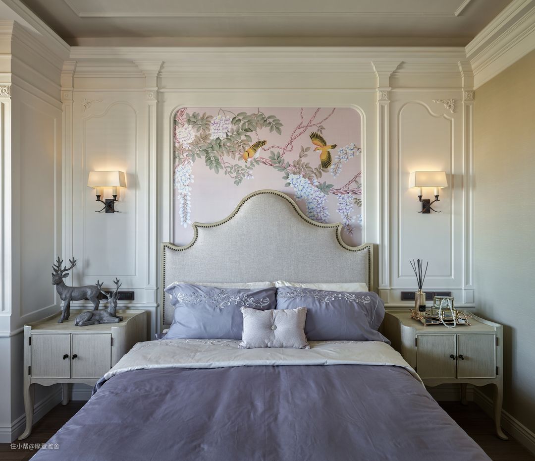 主卧床头妆点比翼双飞的花鸟图腾,充分展现夫妻和谐的浪漫氛围。