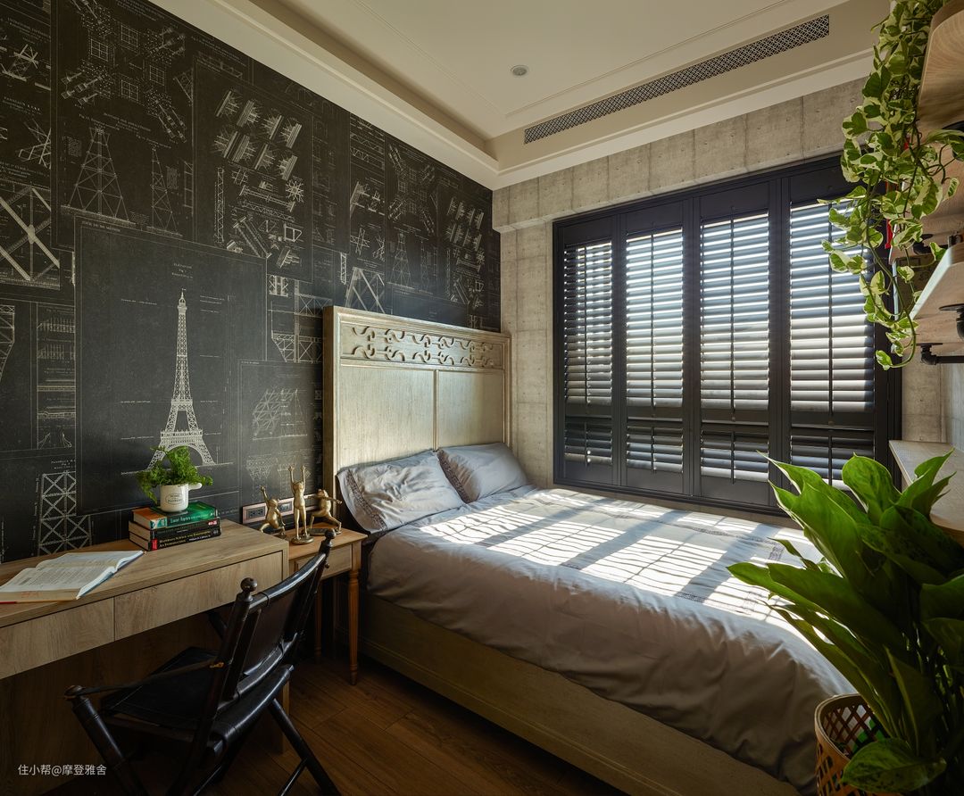 两间男孩房则各自凸显不同的个性,一间透过墙上的复古世界地图,散发浓厚的知性气质;另一间男孩房则保持文青质感,采取轻工业风为空间主调,营造别有滋味的寝卧气氛。