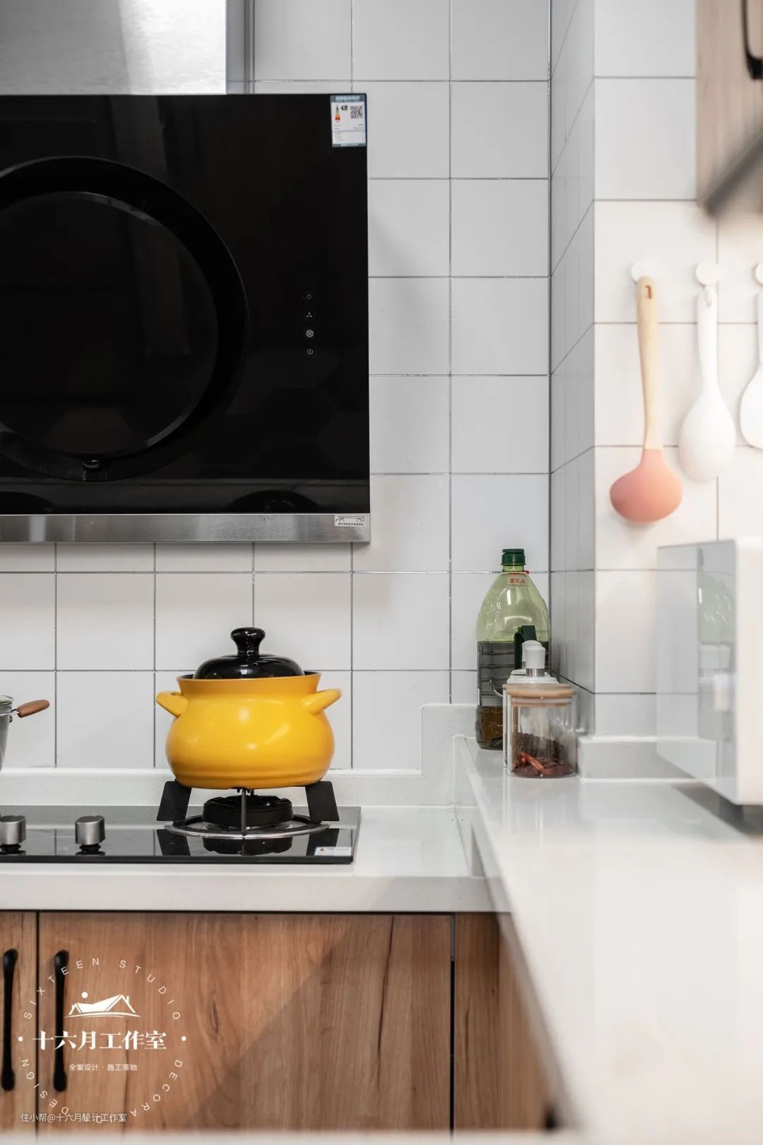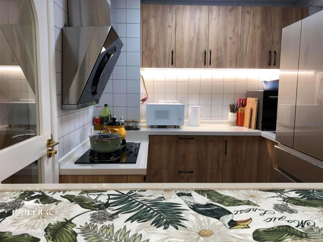 厨房打通部分冰冷的墙壁,增加了家庭的日常互动,小吧台成为了日常生活的点睛之笔,让家里情调瞬间提升,呈现出无隔断一体化的独特魅力。