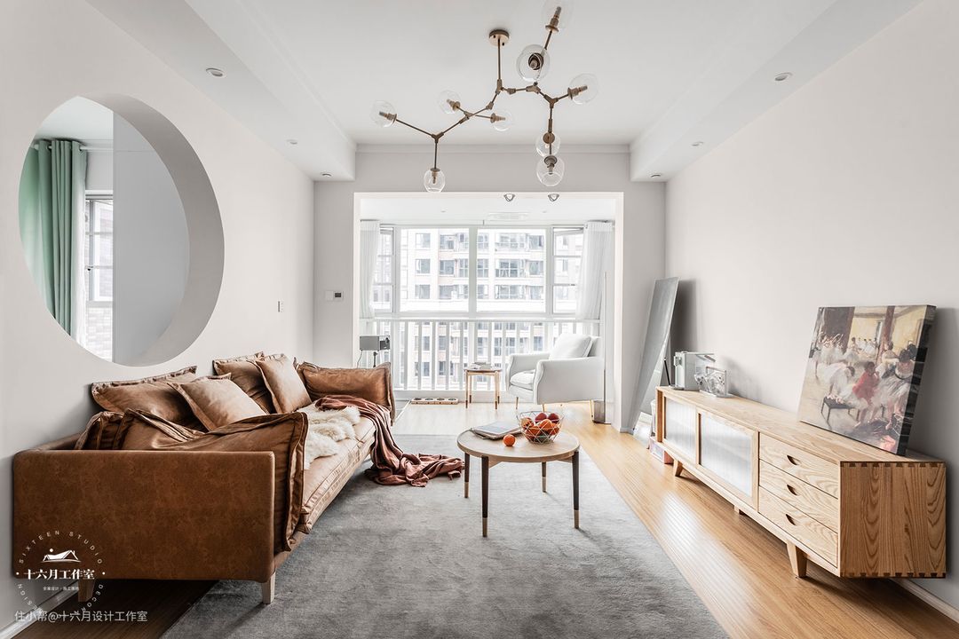 ⑤客厅沙发背景墙做了借景,视觉感很强。