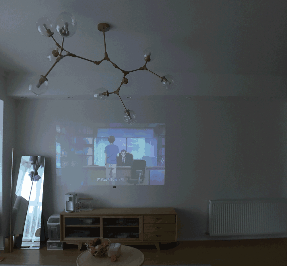 摒弃传统的电视机,顶部悬挂投影幕布,打开全新视觉体验。