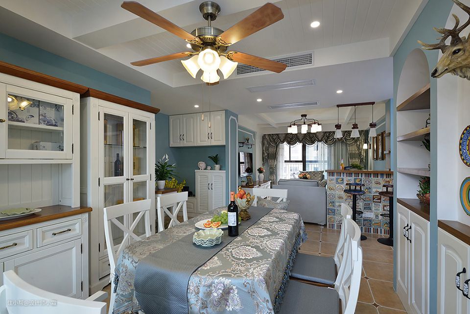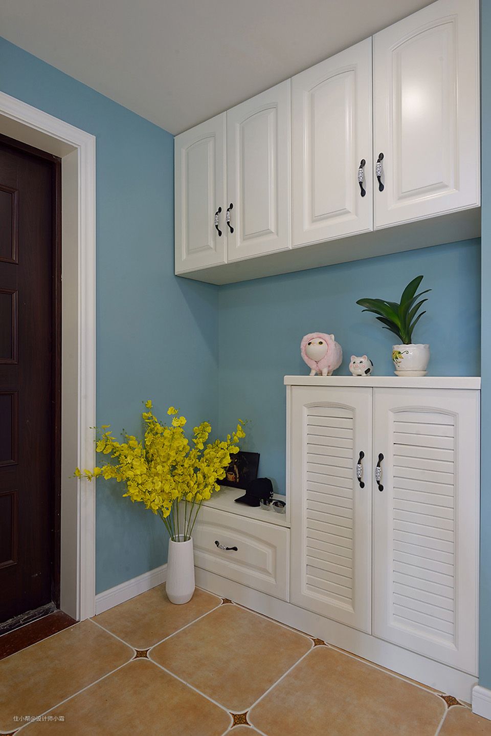 入门即见蓝色的墙面,搭配白色的玄关柜和暖色的地砖,在鲜花绿植的衬托下,让居室内的自然气息完美凸显