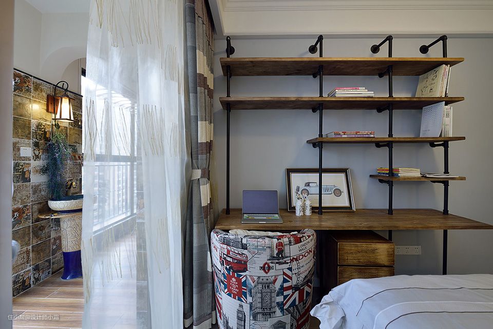 同时设计师还在房间里布置了游乐区域和写字桌,实木桌面搭配黑色铁艺,给人一种别致却满富格调的韵味