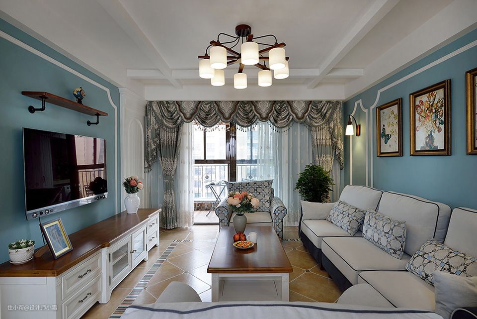 走进客厅,选用米白色沙发和精美的格子抱枕,搭配浅蓝墙面,营造出田园风自然、简朴、高雅的氛围
