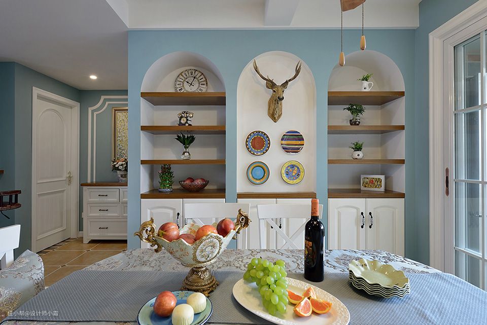 而在餐厅背景墙上设计了别致的壁龛,搭配实木板材做柜子,用来放置装饰品,整体搭配起来视觉感显得十分舒适