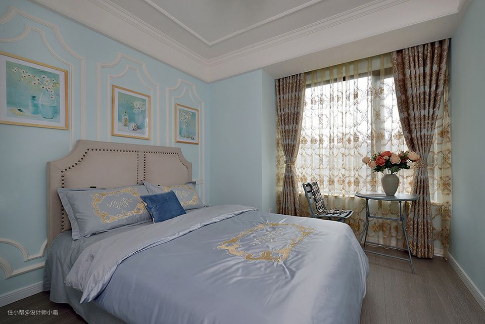 女孩房大面积的天蓝色会让空间显得干净整洁,床品粉中有淡蓝,搭配得十分到位,也显得十分舒适