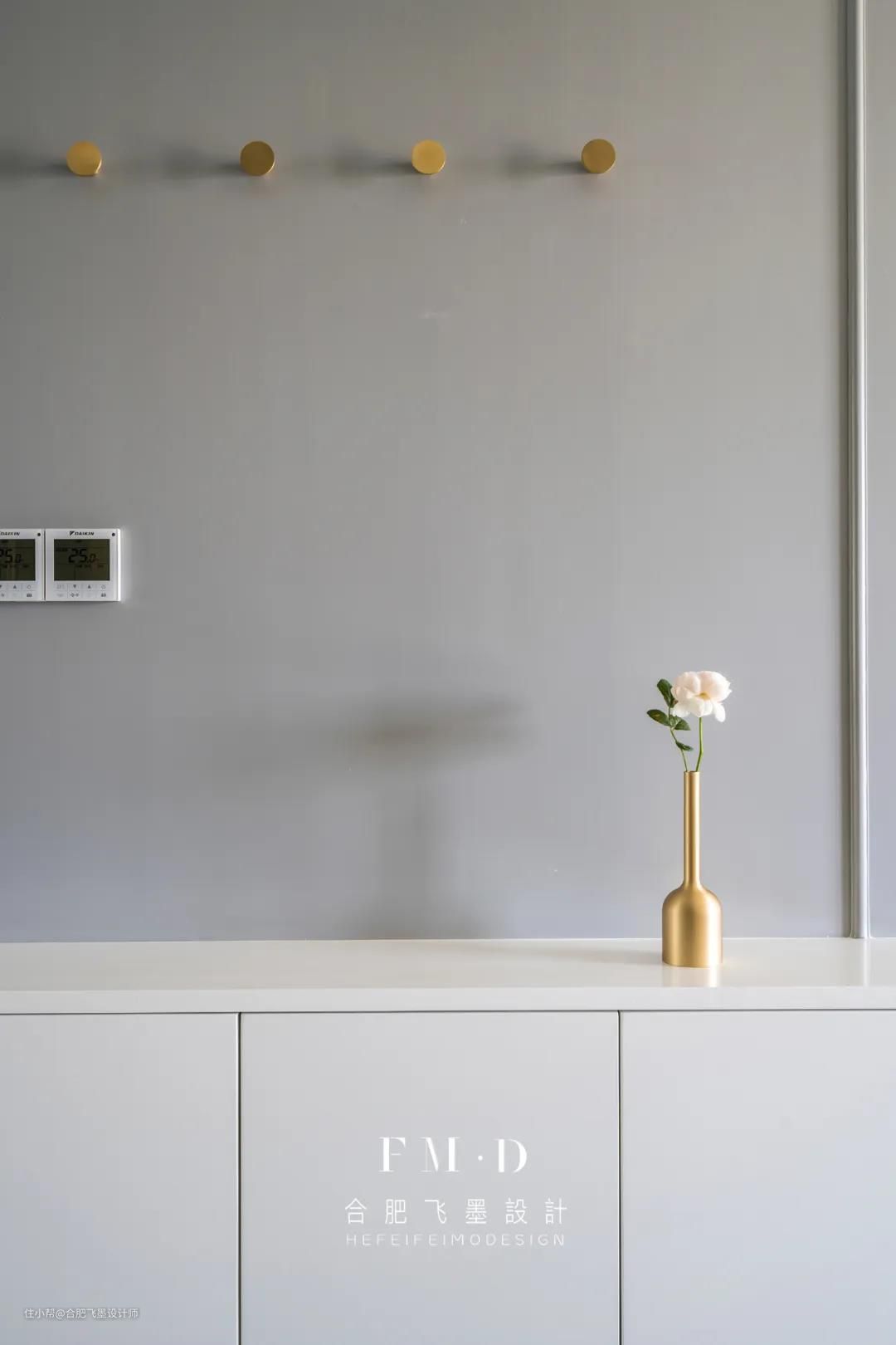 门侧也没有繁杂的装饰、多余的家具,一个现场手工制作的玄关柜“漂浮”在墙体之上,几组简单的挂衣架充盈了玄关的实用性,简约至此,却又不失格调,一抹暗香袭来,让人身处其中,感受到空间的张力与大气。