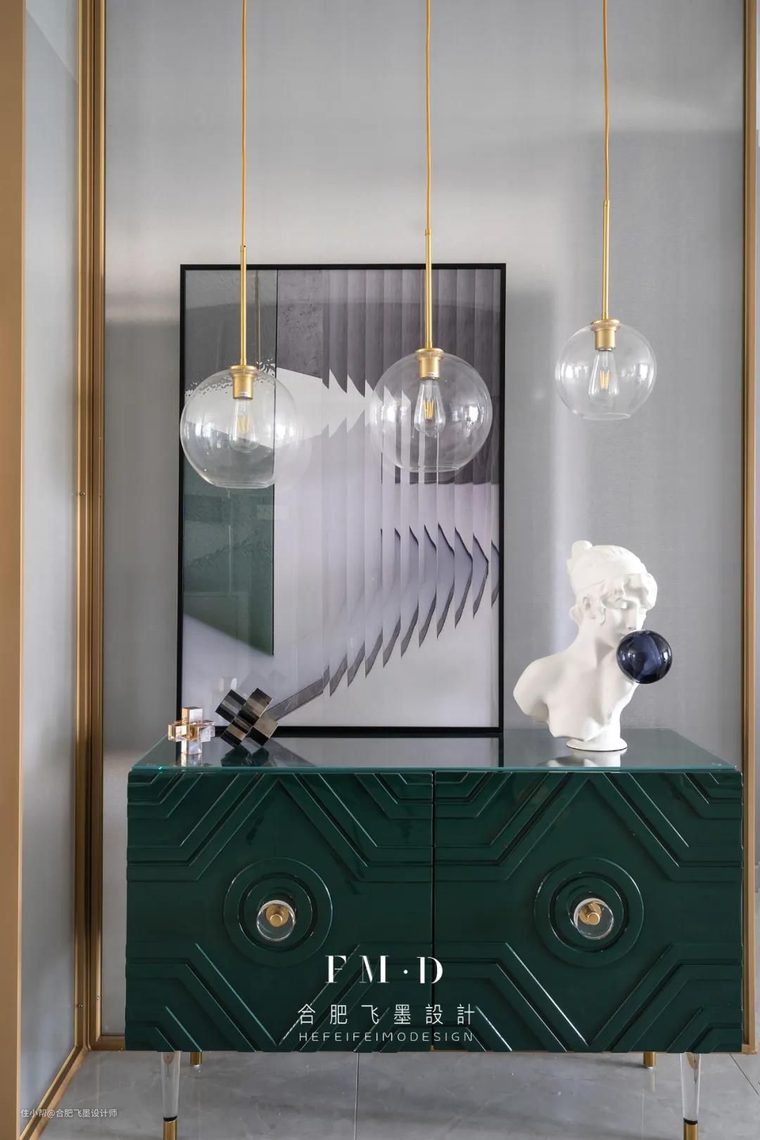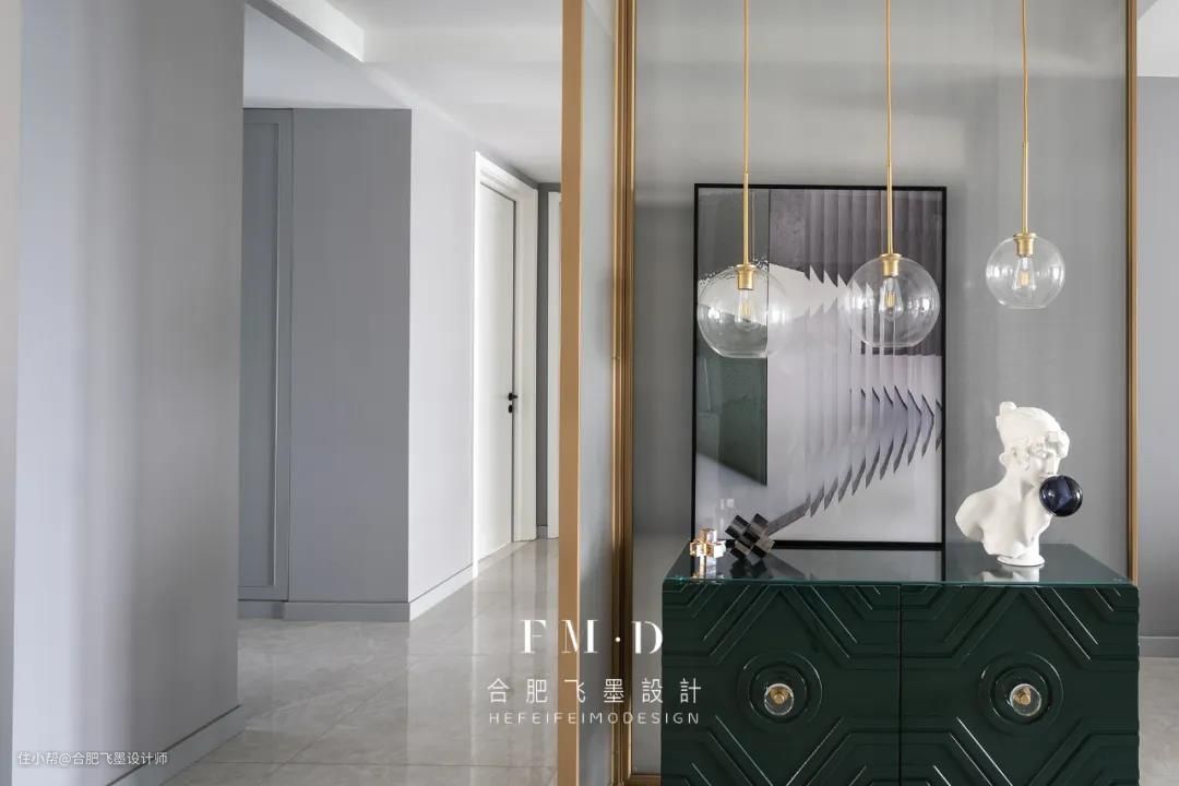 轻启门扇,一脚便从喧闹的城市踏入宁静的家里,映入眼帘的,便是一抹绿与金交织的画面,保证了视线的通透,延伸了空间的维度。