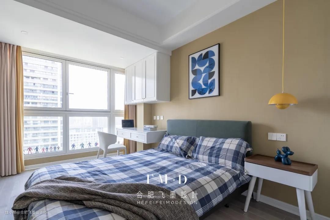 次卧结合了卧室+书桌+收纳的功能,全方面满足屋主孩子的生活与学习,米黄色的主色调与床头小巧的灯相映照,让空间更加的个性化。