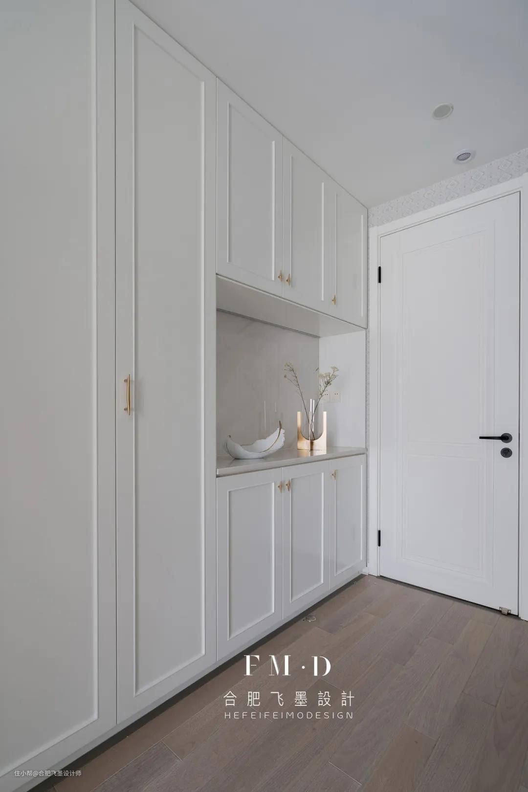 进入主卧室后,侧边墙一排柜子到底,实现卧室超强储物收纳,胜过一间单独的衣帽间!