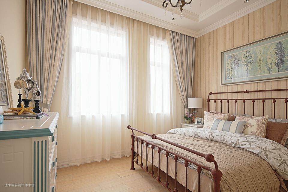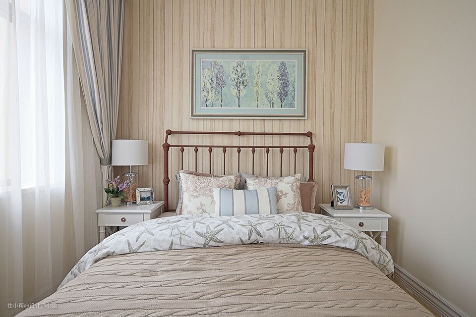 次卧不同于主卧的设计,没有继续使用蓝白相间的布置,更多的是使用了暖色调,能让人感觉到温馨的气息