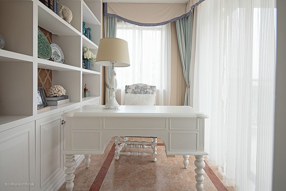 为了满足男业主办公的需求,设计师在阳台位置打造了独立的书房区域,大面积的落地窗不仅采光充足,而且显得十分优雅