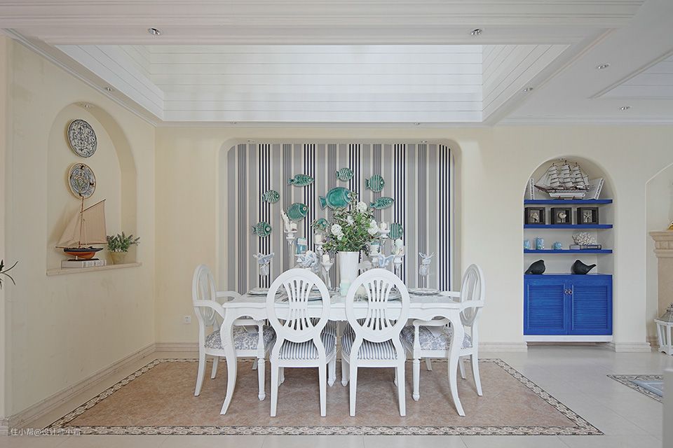 餐厅空间里加入了些纯度相对较高的装饰元素,在海洋风情背景墙的搭配下,造就了一个非常温馨的地中海小家