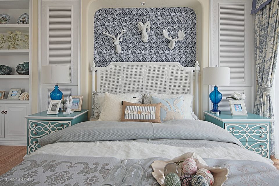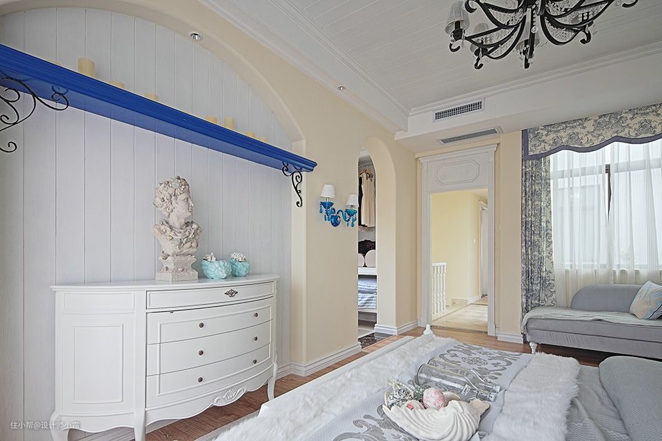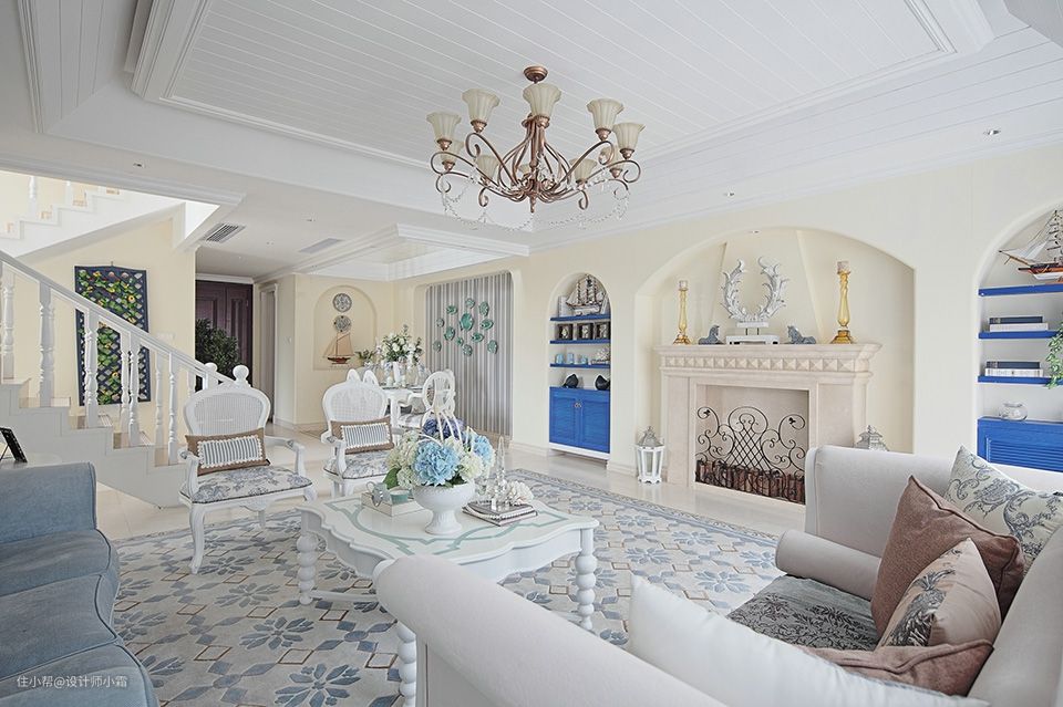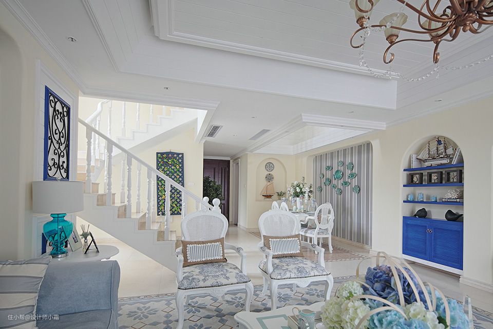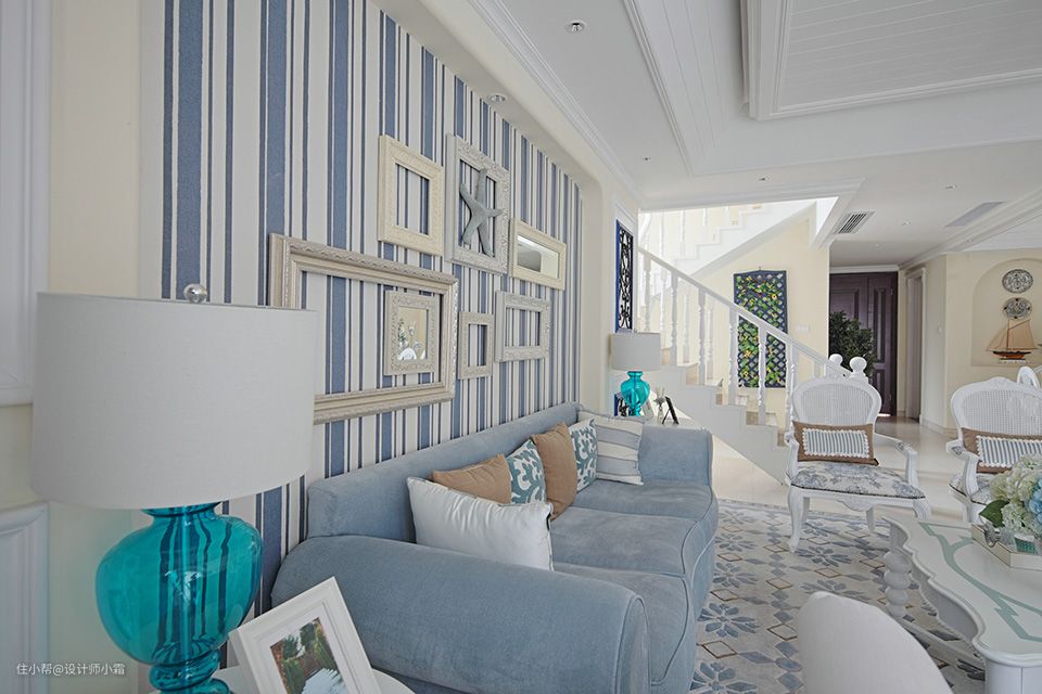 走进客厅的蓝白相间,好像泛起的海浪,简单造型和欧式家具的衬托下,将浪漫唯美的气息完美展示了出来