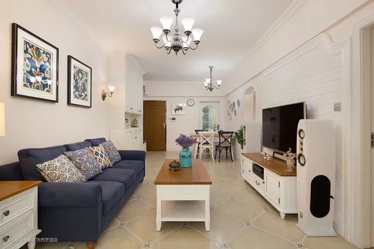 蓝色的沙发与杏色调的客厅相配;