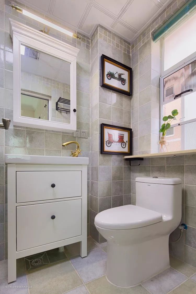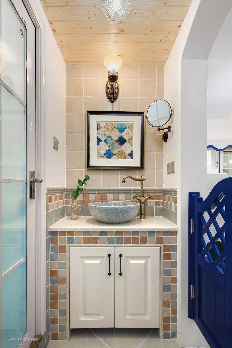 洗手台用砖砌而成,铺贴的多彩色调小砖显得温馨又突出家的味道;客卫采用干湿分区设计,比较符合日常起居的使用习惯