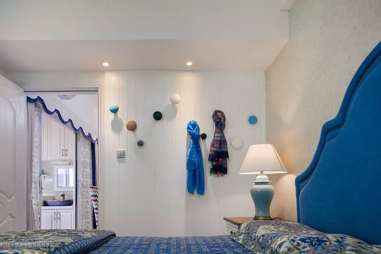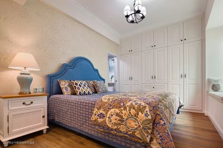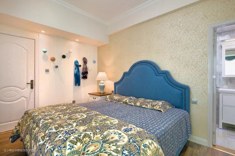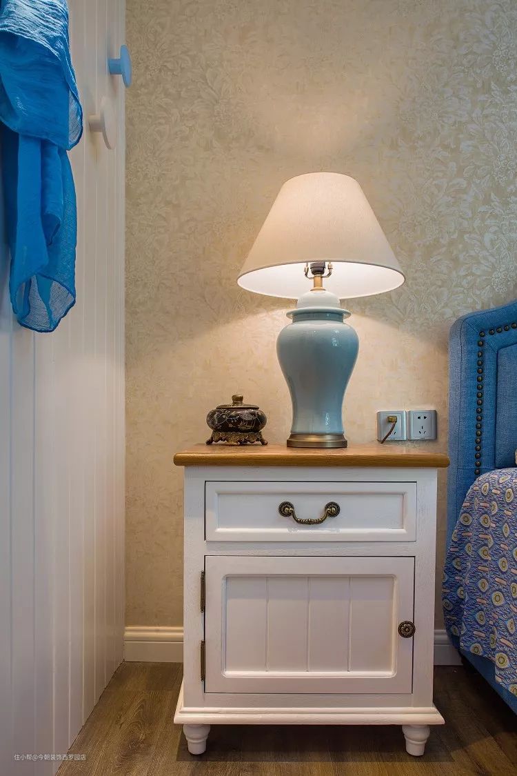暖暖的灯光配上蓝色的床头靠背显得很温馨