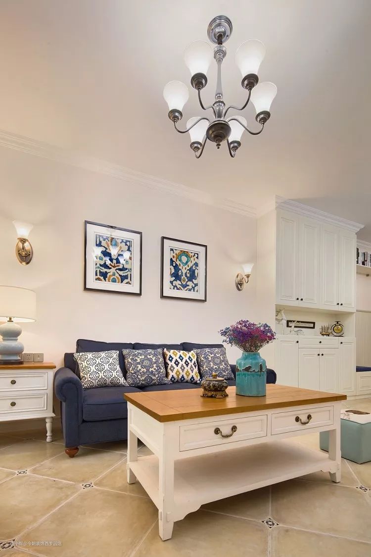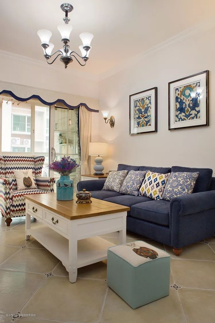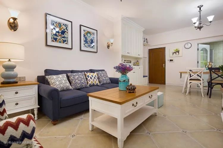 蓝色的沙发与杏色调的客厅相配;