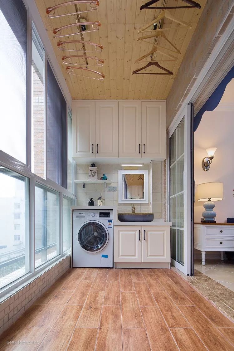 小小的阳台设计别出心裁。首先设计上、下两层储物柜;下层设计独立半封闭空间放置洗衣机,中间一侧设计洗手盘和梳妆镜;另一侧设计置物层架;