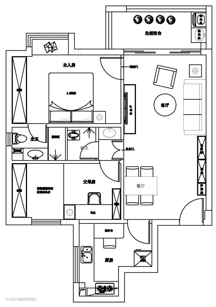 进门与阳台处上、下两层储物柜的设计为这个小户型增加了不少收纳空间;把原来的卫生间一分为二,让七十平方米的小空间也拥有才梦寐以求的主人套房,实现了两房两卫空间。我们在满足生活上方便的同时,把各个方位空间精雕细刻: