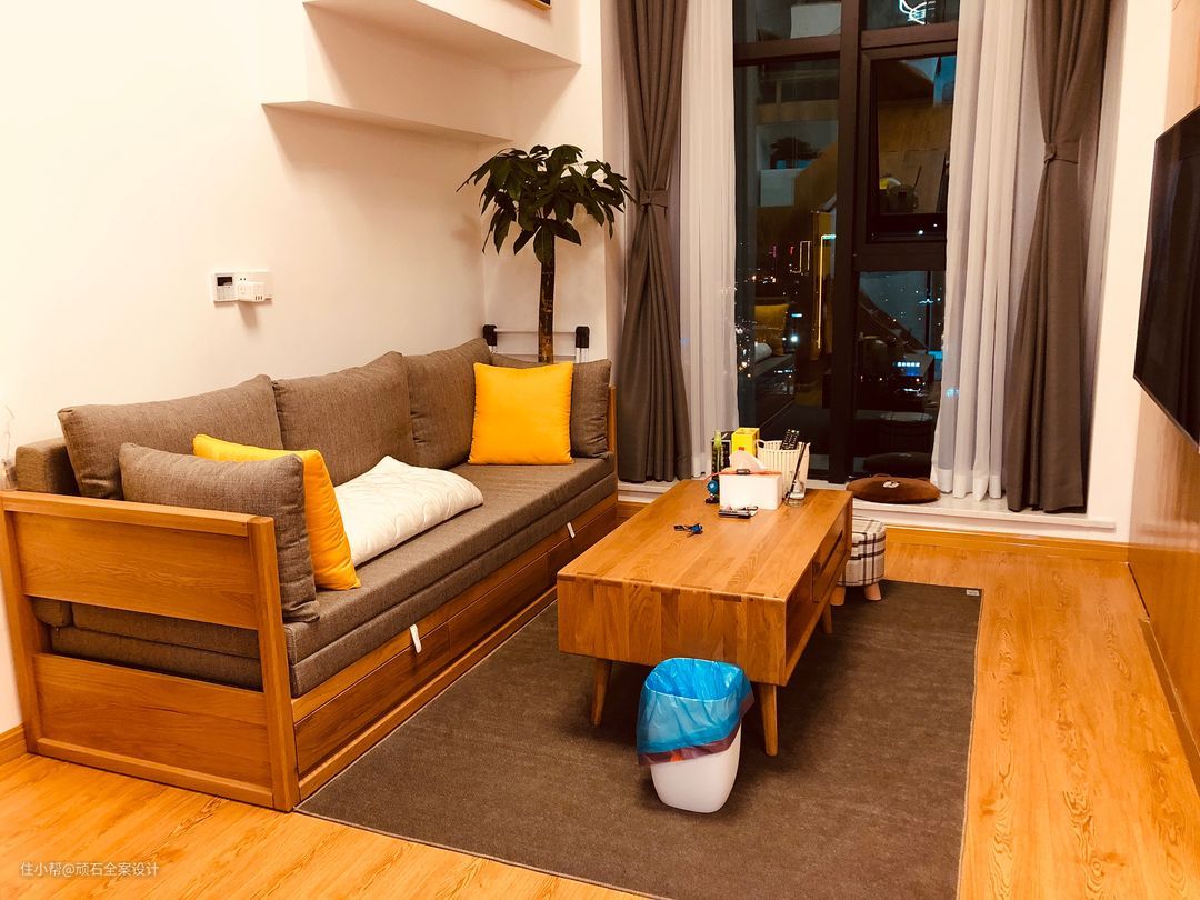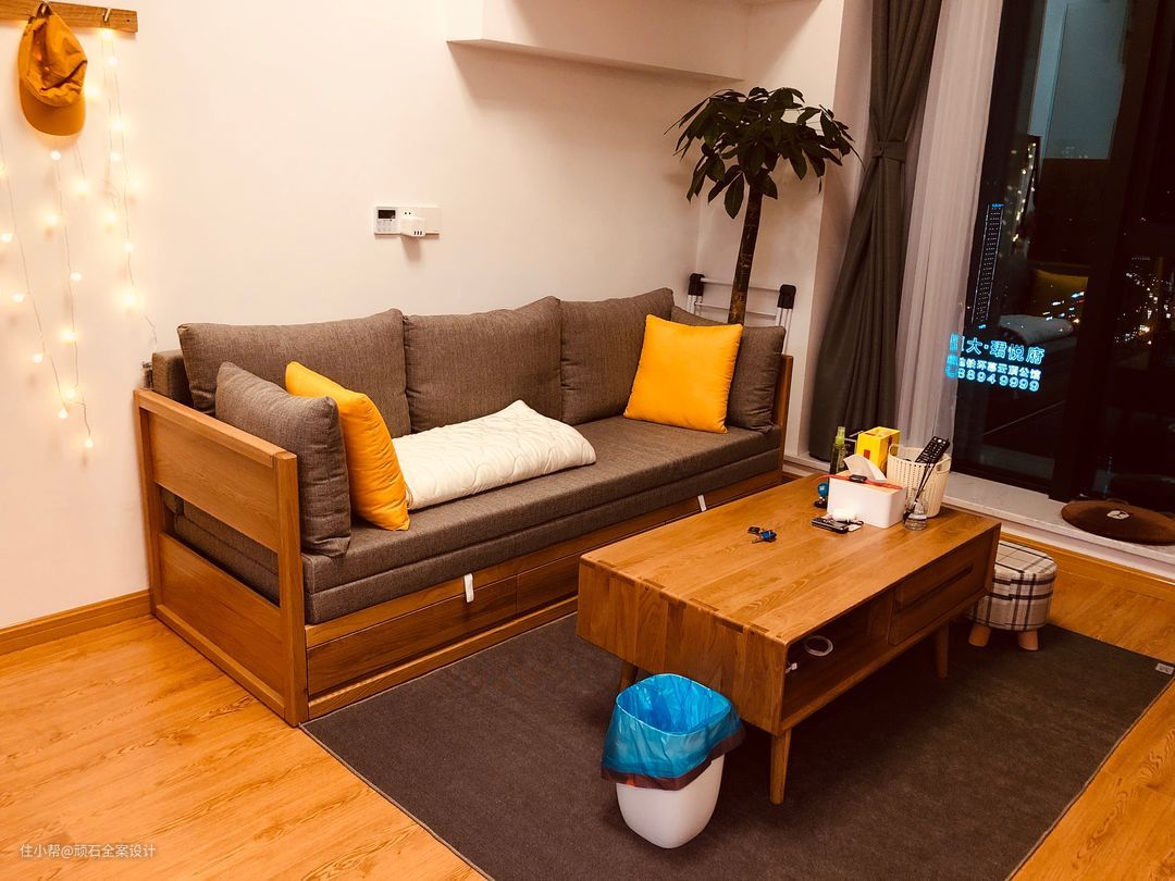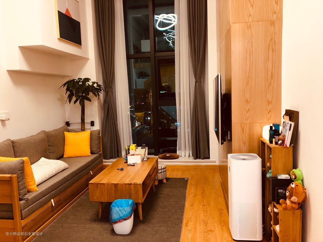 由于开放商之前说窗户两边的空调机位可以拆除,后期又说不能拆除,一边我们采用了用柜子把一个空调机位和一个构造柱包在柜子里,这样既能增加储物的空间,也能把电视挂在柜子的门板上,沙发上空的空调机位就简单的做了个造型~