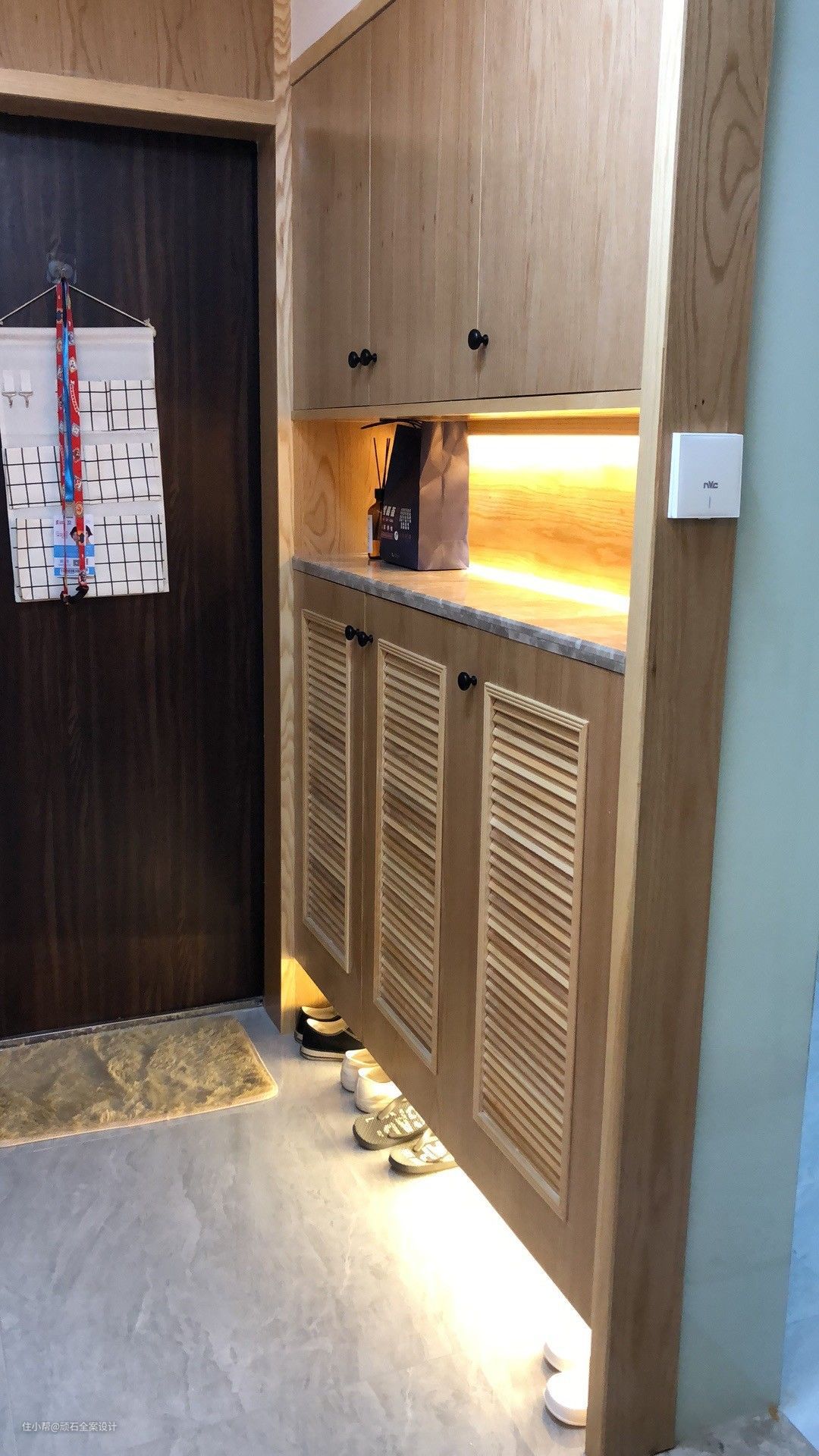 因为鞋柜位置原因只有做的窄鞋柜,采用最下方镂空,这样好放常换的鞋子,中间镂空可以让业主一进门就可以把包包以及钥匙很顺手的放在鞋柜上,在加以两组氛围灯这样让鞋柜更有感觉!