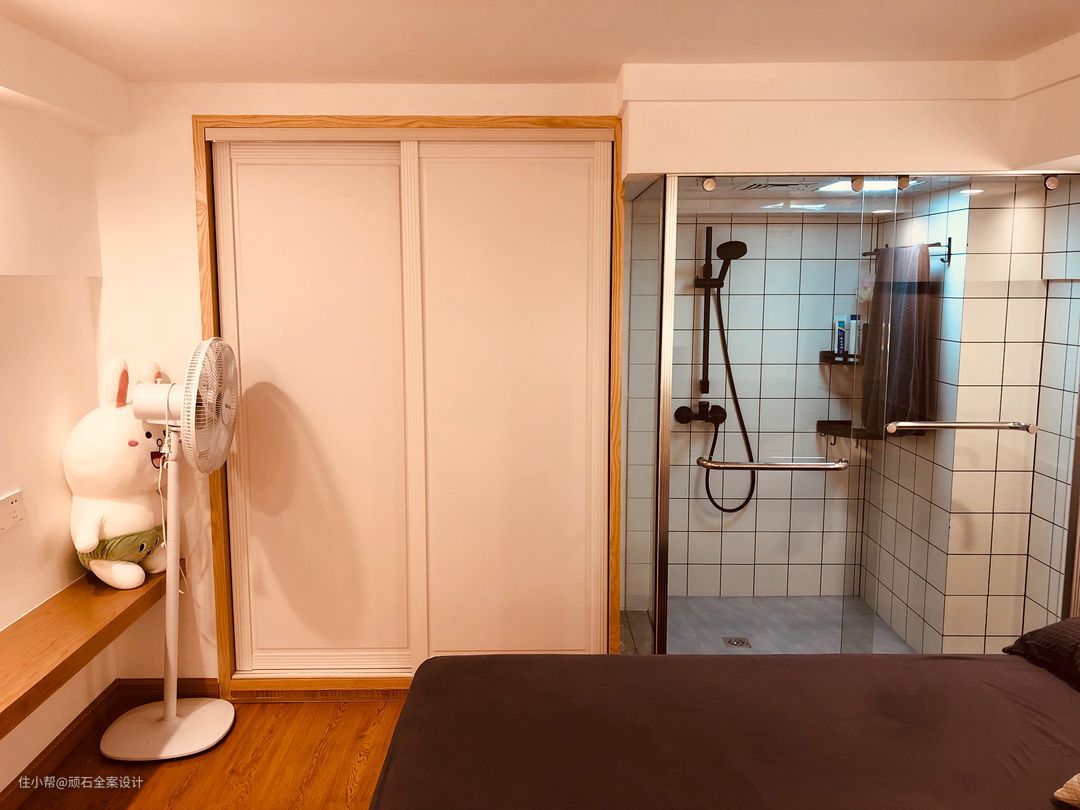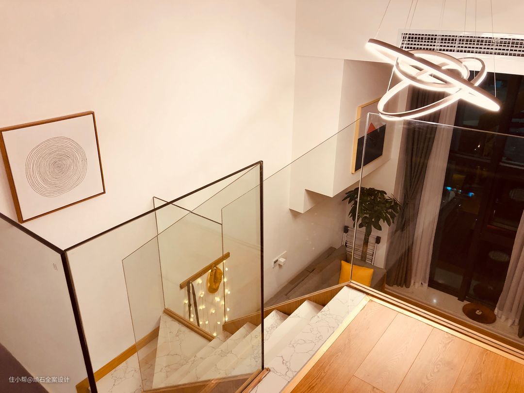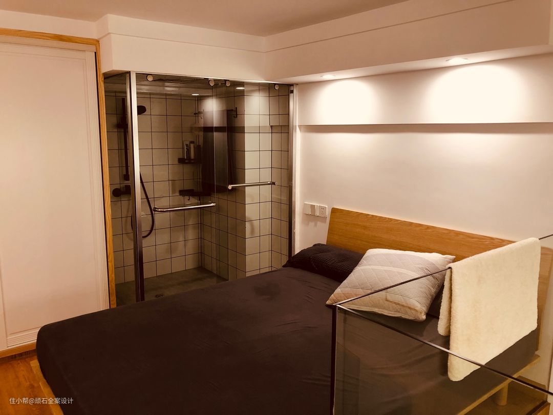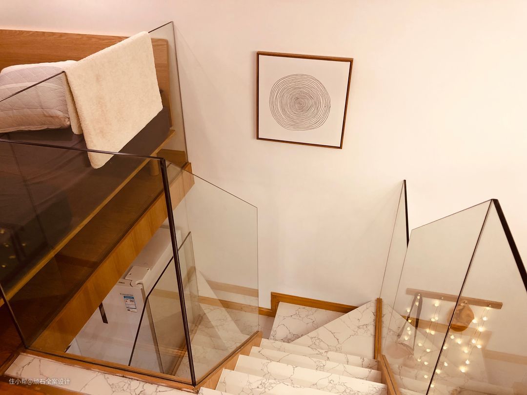 - 2楼卧室 由于业主一个人住和2楼整体位置比较窄,2楼的卫生间门的采用的玻璃,卫生间也只能洗澡用~楼梯踏步就是用的白色的石材、