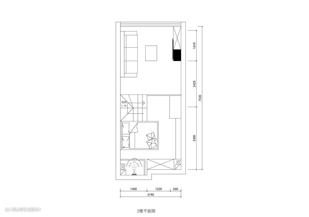 - 2楼卧室 由于业主一个人住和2楼整体位置比较窄,2楼的卫生间门的采用的玻璃,卫生间也只能洗澡用~楼梯踏步就是用的白色的石材、