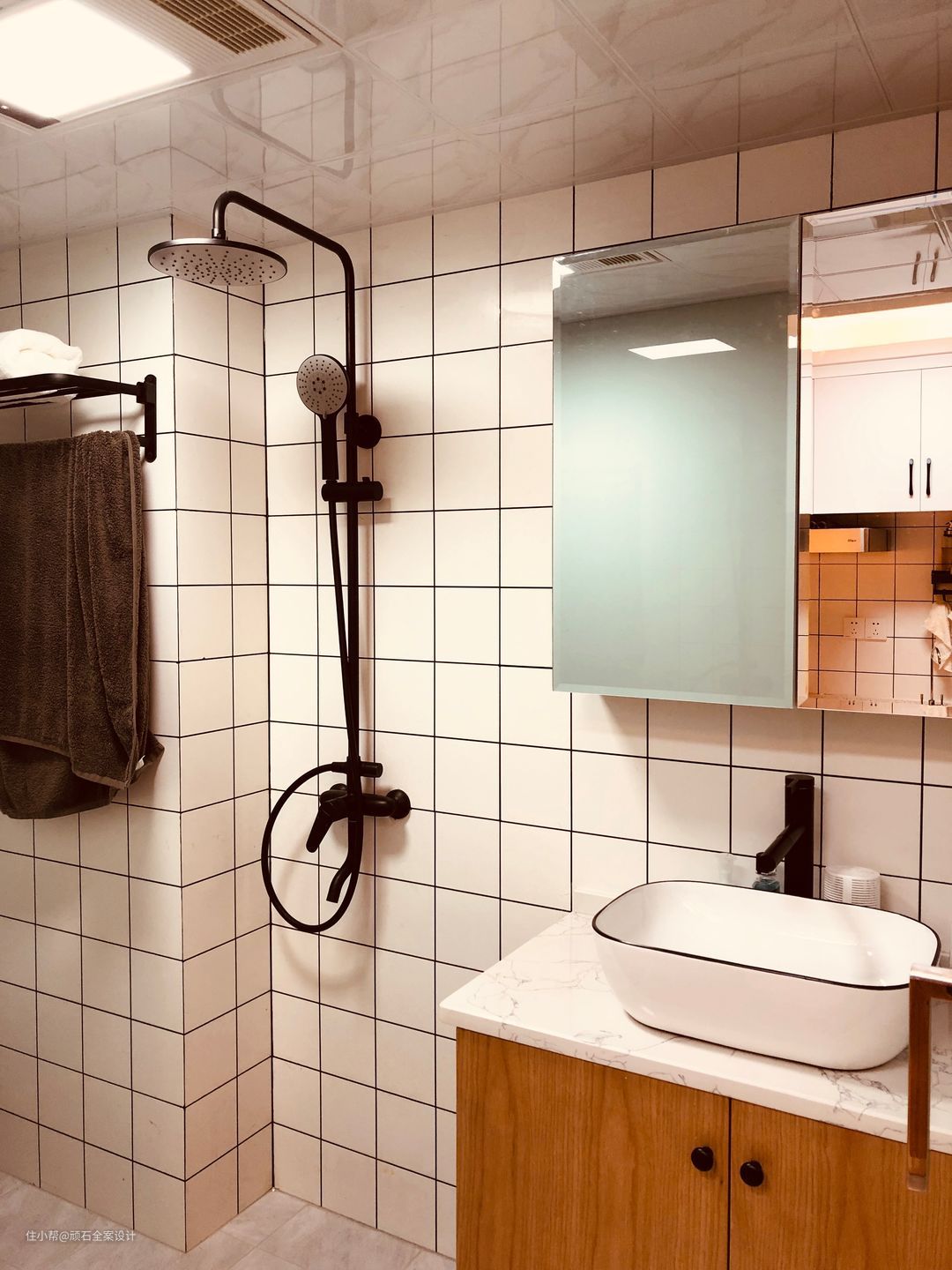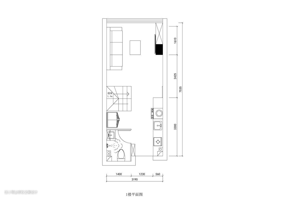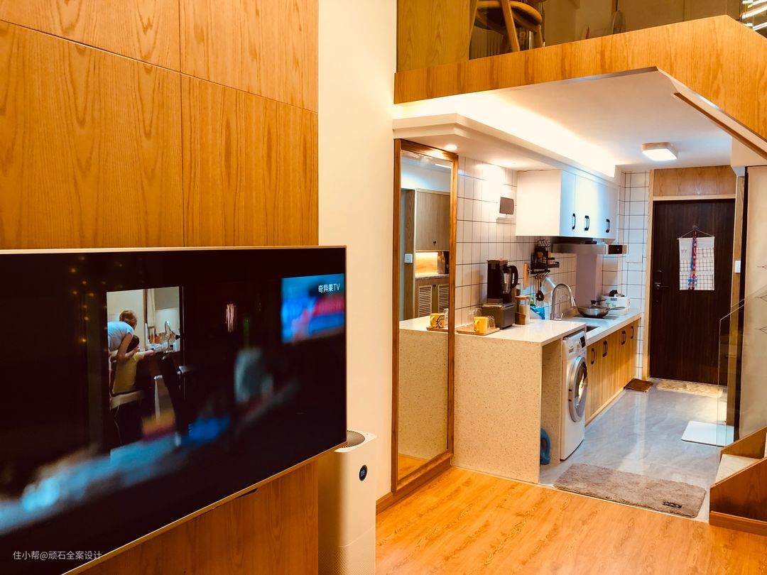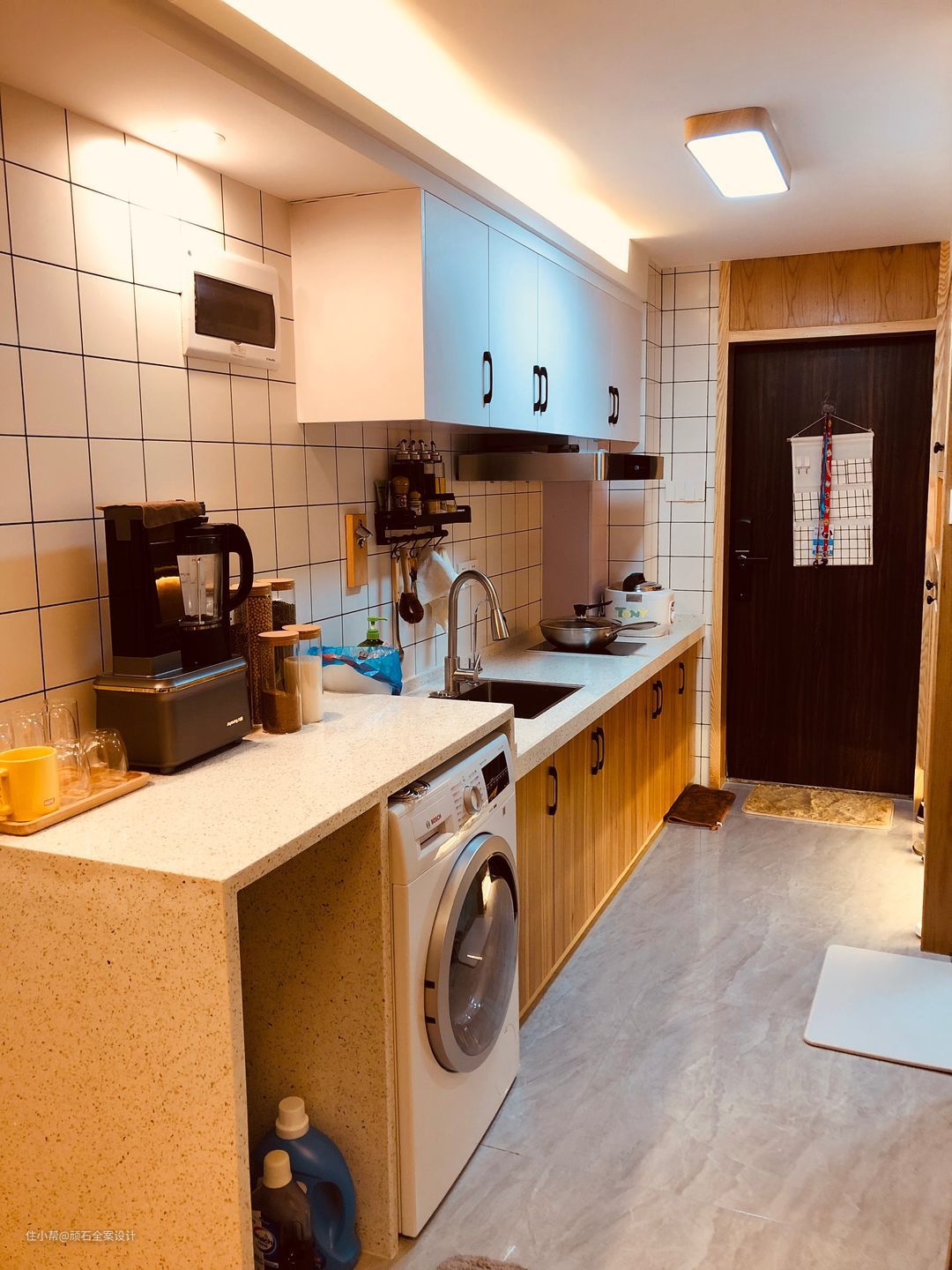 厨房上方吊顶做了个造型,加了一组的灯带,因为公寓是没有气的所有的电器都是用电的,所以考虑厨房电器的时候特别要注意!墙砖采用的300*600的小白砖,地面就是灰色800的砖加工成400*400的铺贴的