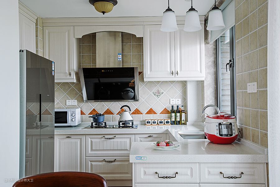 厨房与餐厅打通,选了传统美式经典配色方案,全白色柜体搭配美式把手,背景砖用奶白色,综合柜体的色调中的冷,提升整体饱和度。
