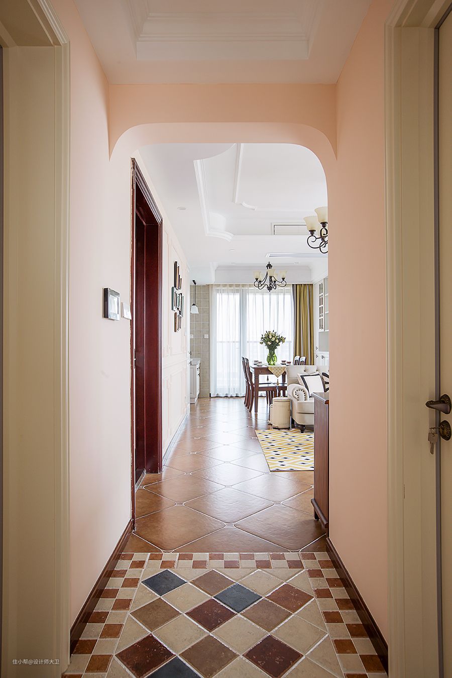 田园风格不等于土气,而是一种贴近自然,向往自然的风格,一种对于回归的倡导。用了美式装修风格中最常用的深黄为主调地砖,拼接浅色菱形花纹和深蓝色菱心,菱形结构具备均衡的线面造型,其对称性在视觉上给人稳定与和谐重复交错的菱形图案更有种自带的高级感。