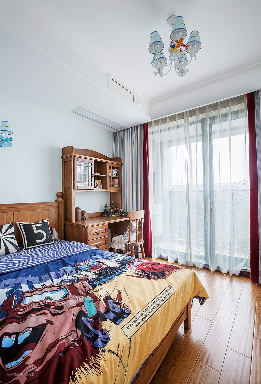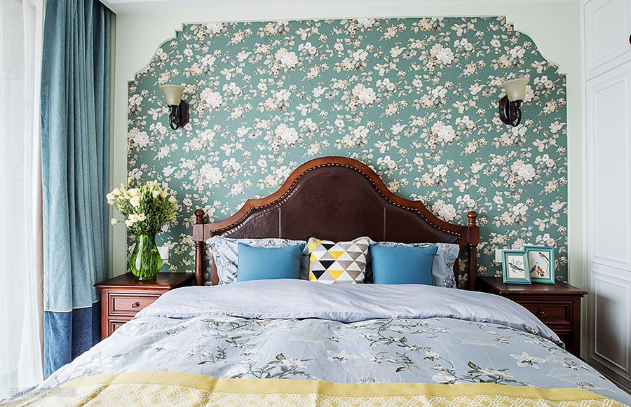 选择墨绿色的背景,搭配上白色花卉配图,在小小的空间之中满足我们回归自然的理想。棕色真皮拼接原木床头板,用青蓝色窗帘作为搭配,其他的家具和灯具来烘托,暖色的床头灯光营造出温馨的效果。