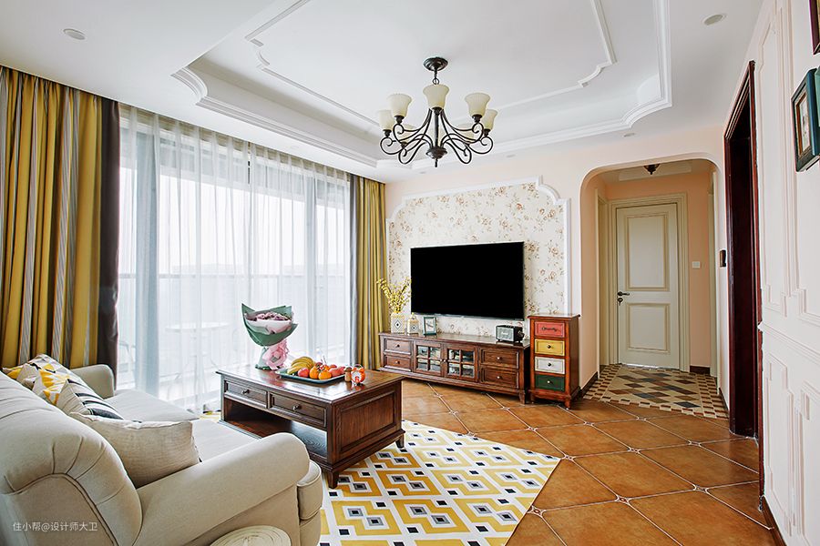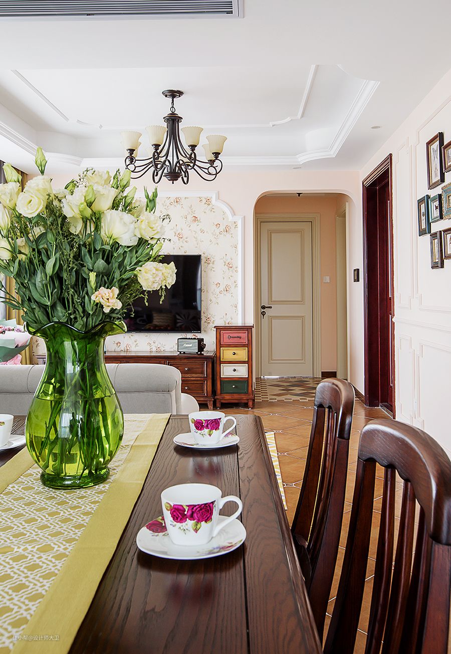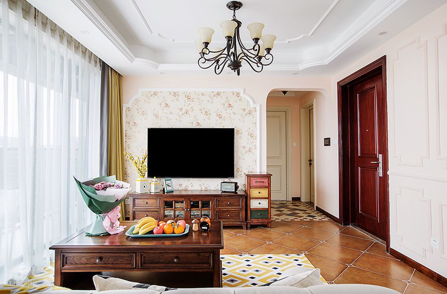 电视背景墙用了美式简约小碎花,电视柜和茶几都用了深原木配色,复古的配色彰显原木原始的风貌,带着返璞归真回归自然的味道。置身在一片轻松惬意的客厅空间,棉麻布的沙发,自由放飞的思绪,调节了来自工作生活的压力,真正的在家的世界绽放。