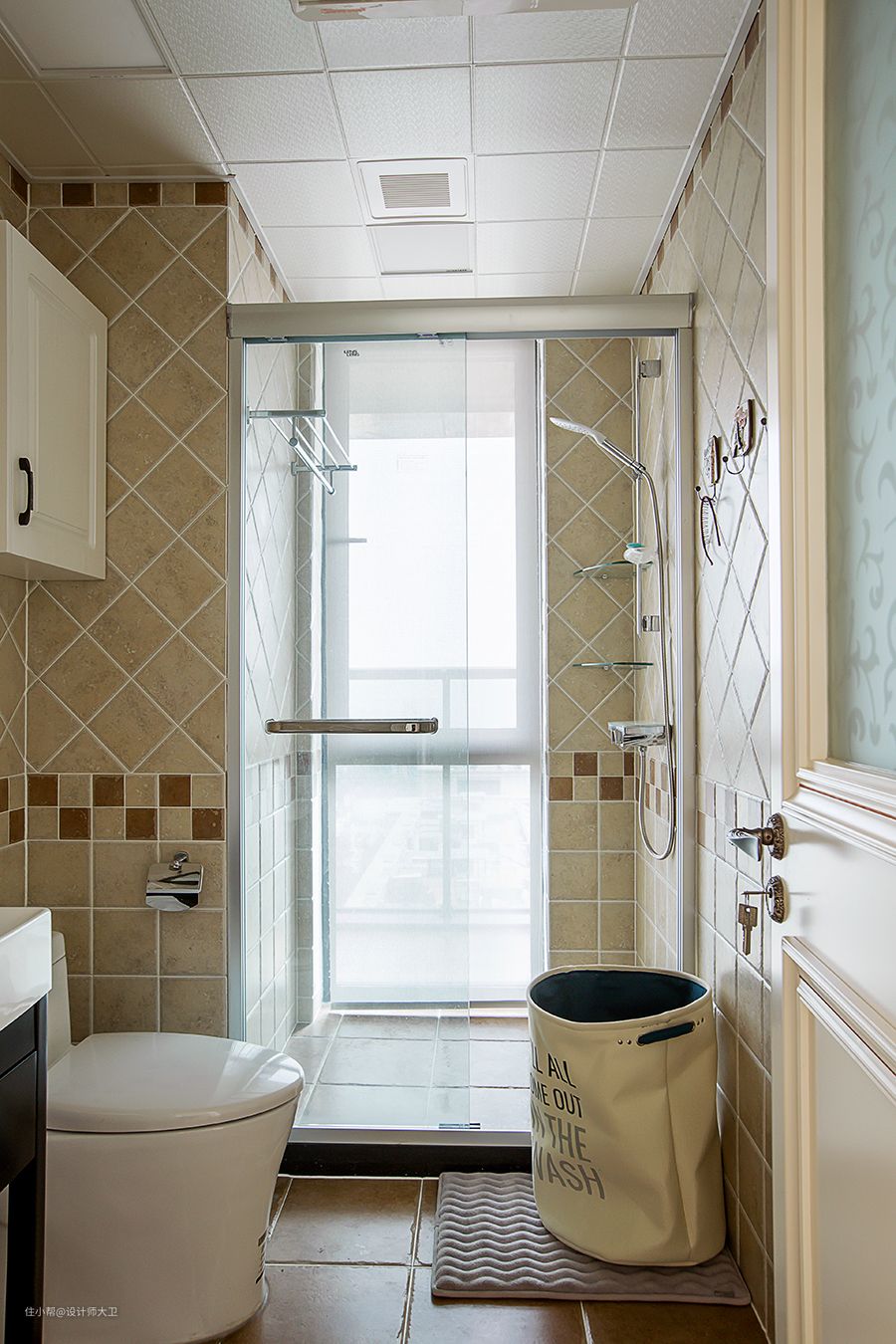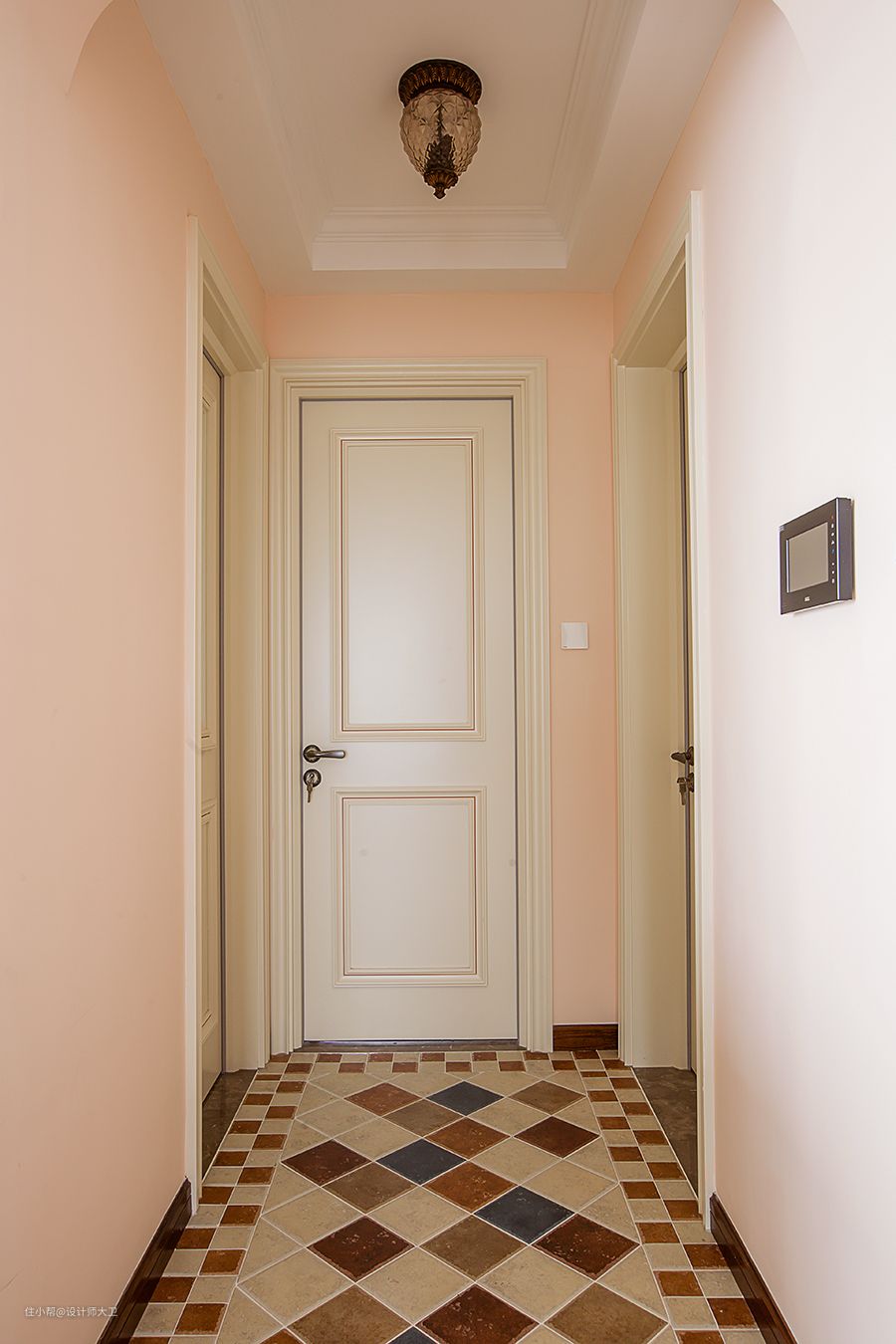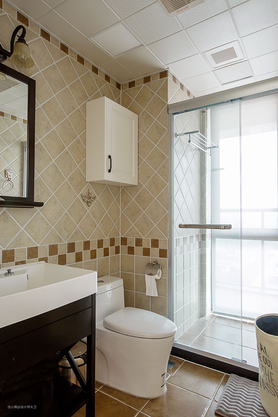 田园风格不等于土气,而是一种贴近自然,向往自然的风格,一种对于回归的倡导。用了美式装修风格中最常用的深黄为主调地砖,拼接浅色菱形花纹和深蓝色菱心,菱形结构具备均衡的线面造型,其对称性在视觉上给人稳定与和谐重复交错的菱形图案更有种自带的高级感。