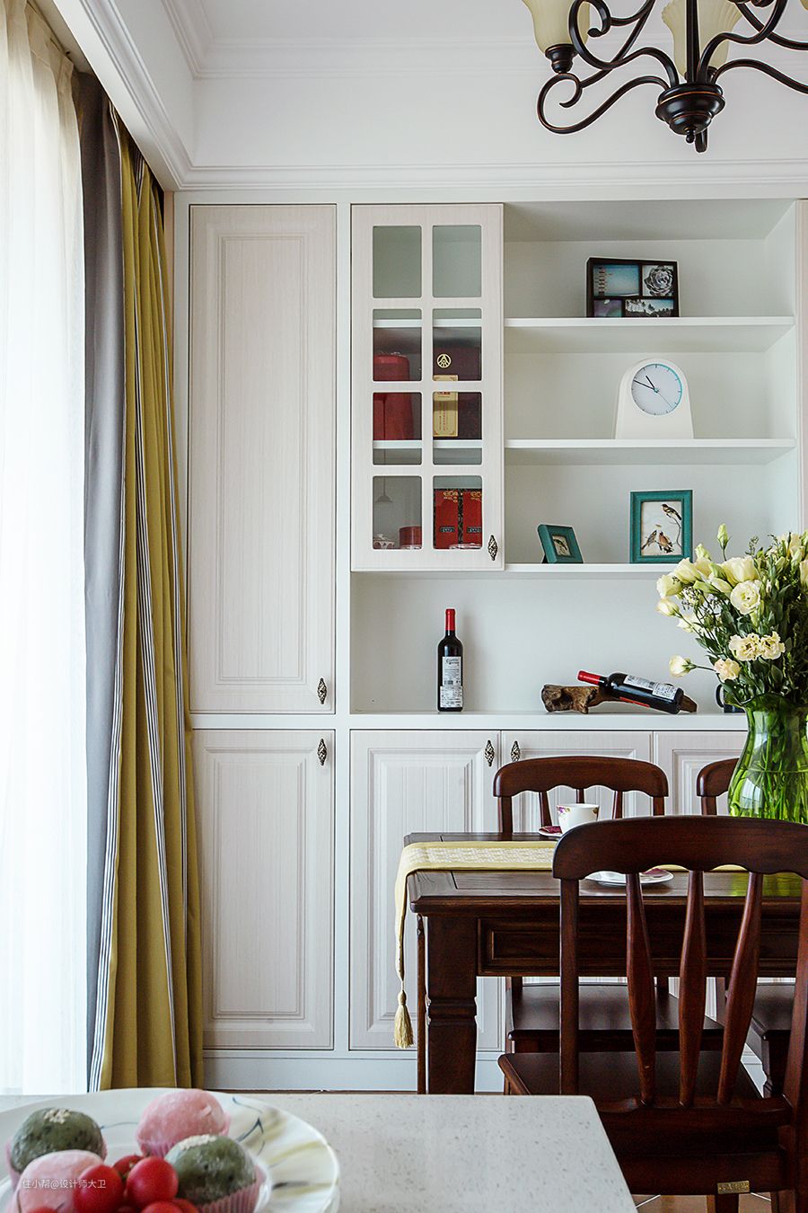 厨房与餐厅打通,选了传统美式经典配色方案,全白色柜体搭配美式把手,背景砖用奶白色,综合柜体的色调中的冷,提升整体饱和度。