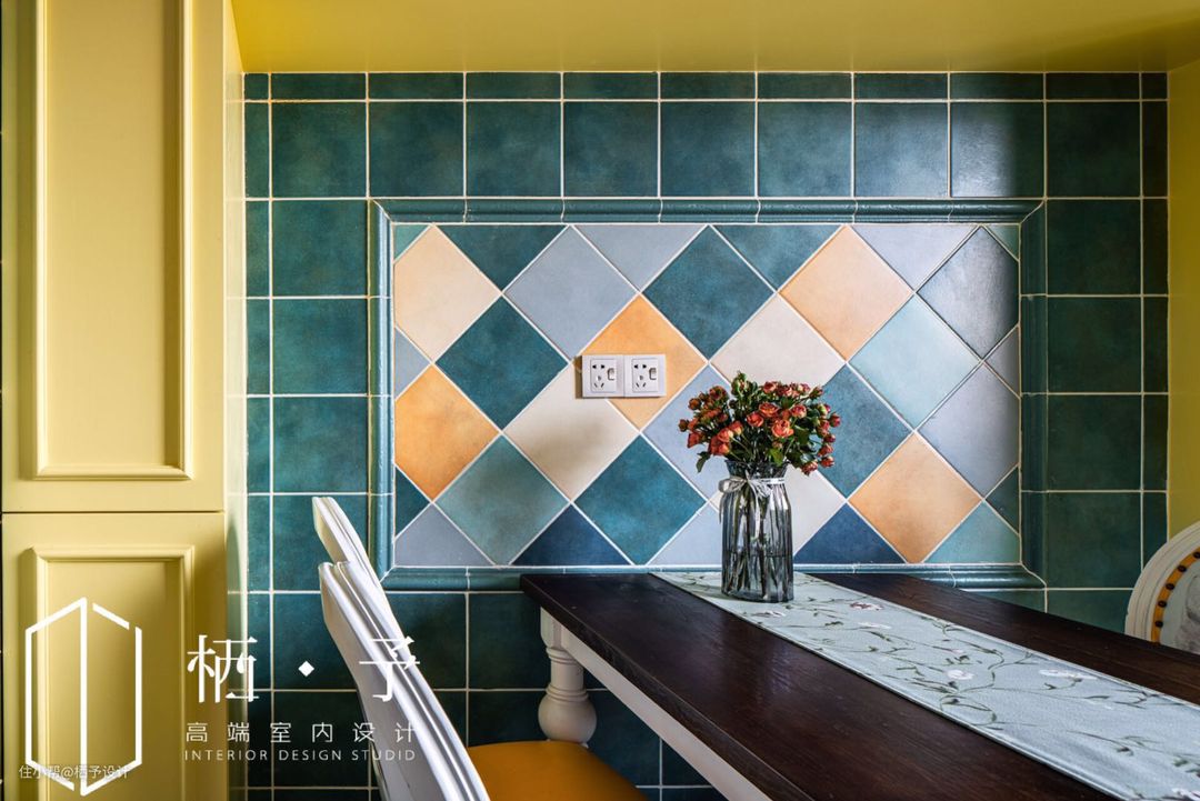 餐厅背景墙就用最基础的原色搭配法,用黄和绿撞色为底,再以植物色彩的红为整个空间营造情感意境。