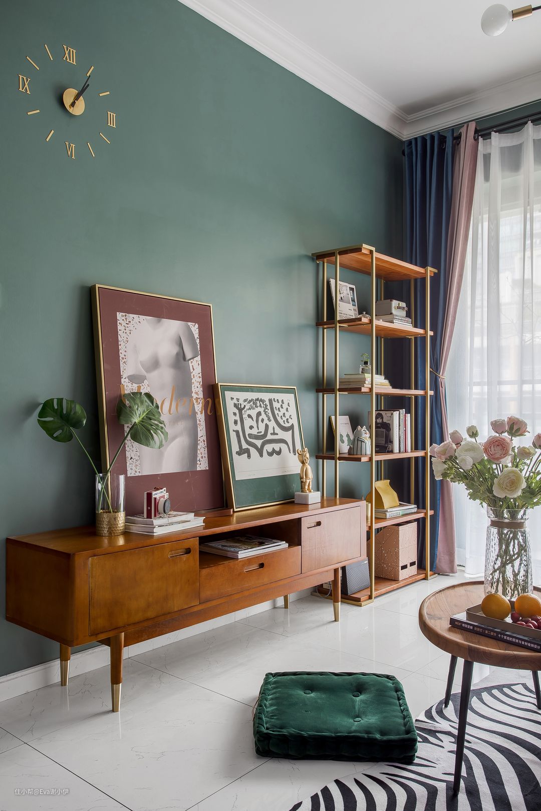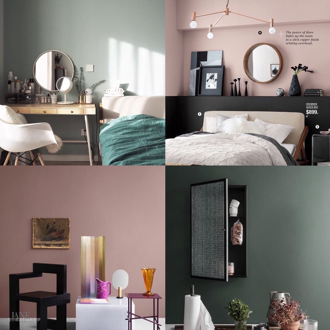 ① 【复古绿】色是我的最爱,作为客厅的主色,担心大面积使用调子太冷,所以搭配了【脏粉色】来中和;